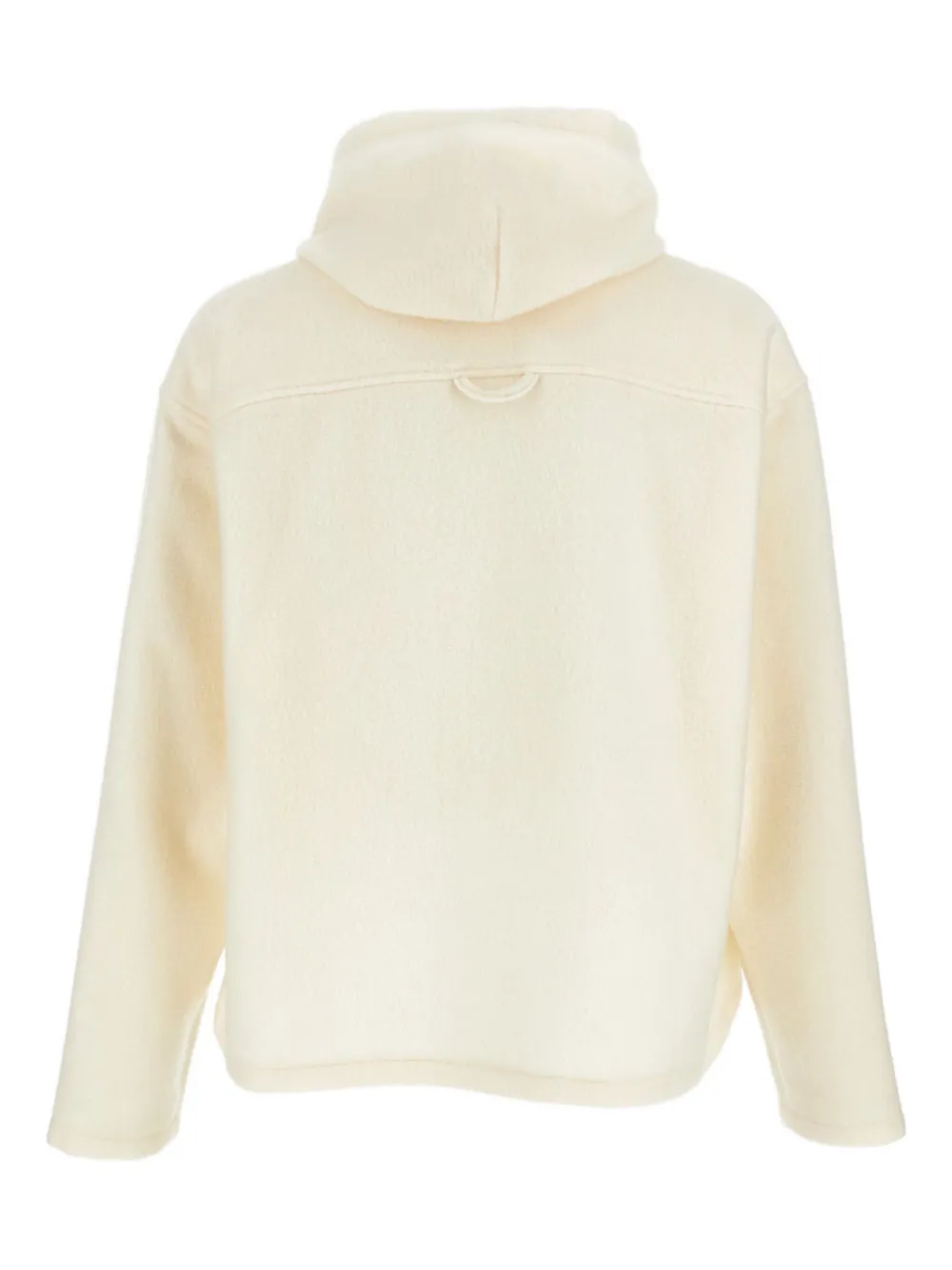 Шерстяная ткань кремового цвета, карман-кенгуру, капюшон, воротник-стойка, спущенные плечи, длинные рукава.