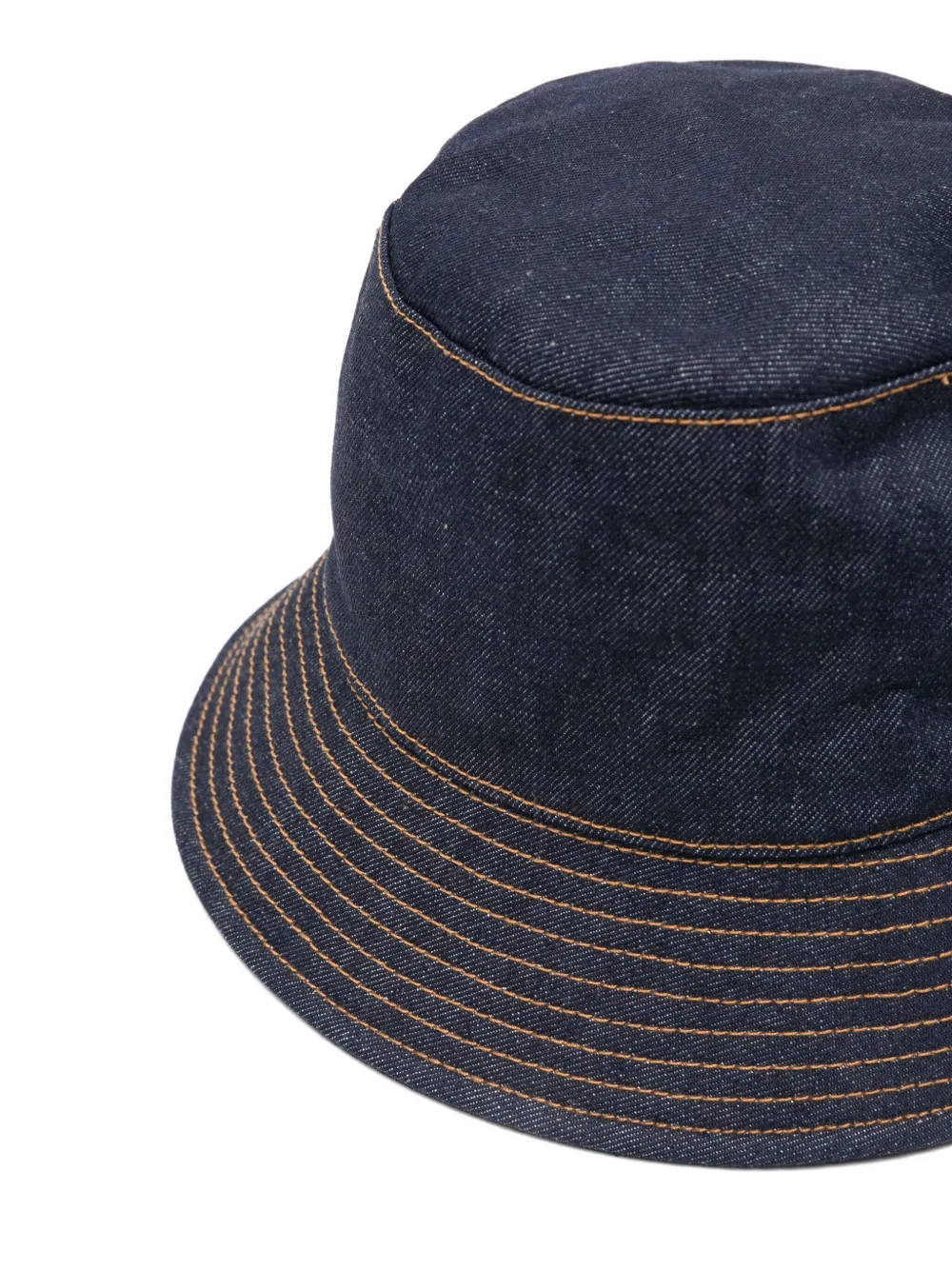 Синяя джинсовая ткань, оранжевая строчка, накладной карман, плоская тулья, широкие поля