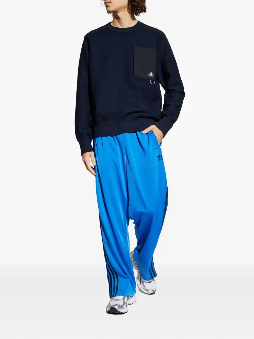Накладные карманы из ребристого трикотажа темно-синего цвета, D-образные заплатки на локтях