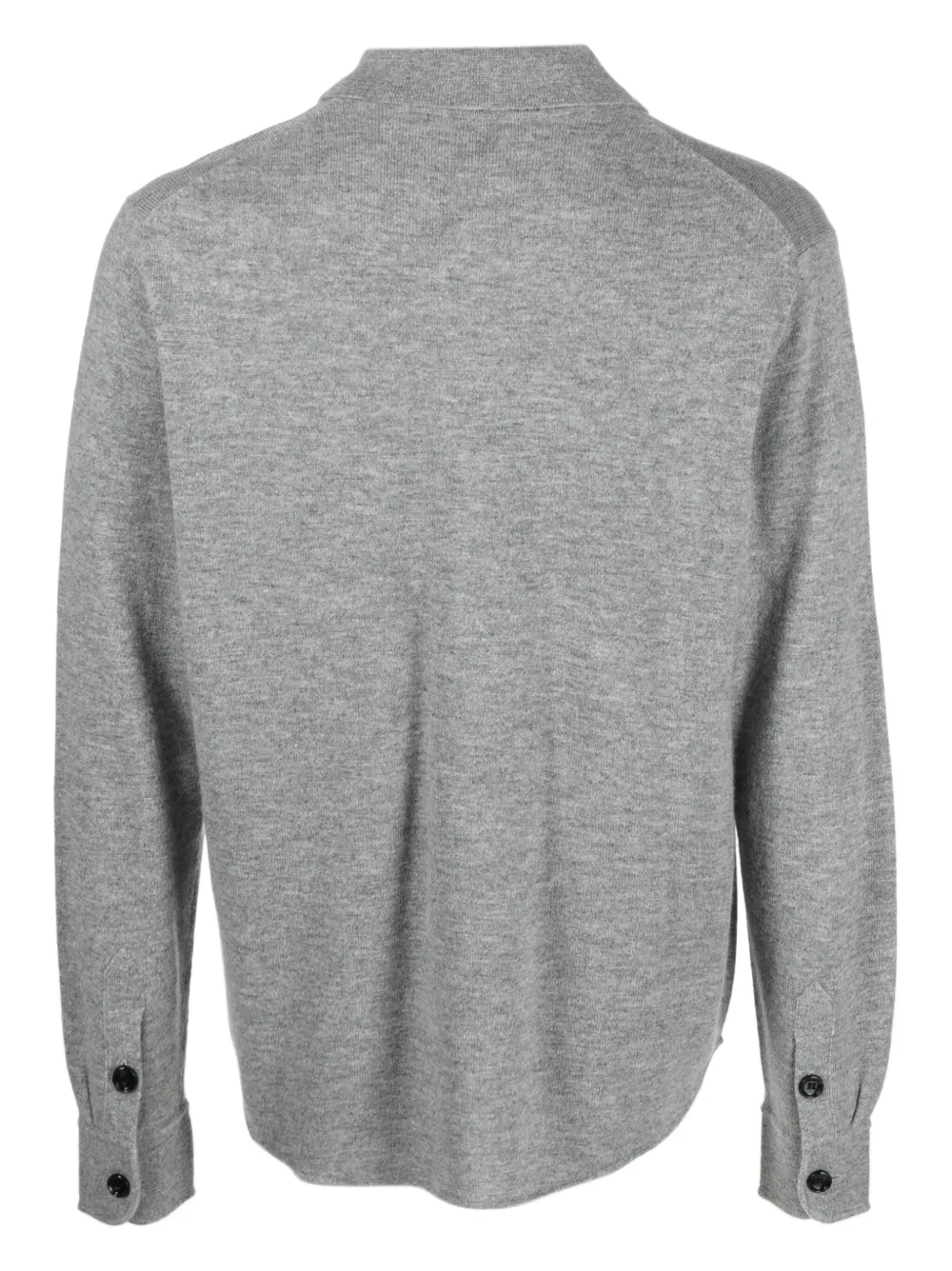 Серый, смесь шерсти и кашемира, трикотажный материал, тонкая вязка, прямой воротник, застежка на пуговицах спереди, два нагрудных кармана с клапанами, длинные рукава, рукава с манжетами на пуговицах и прямой подол.