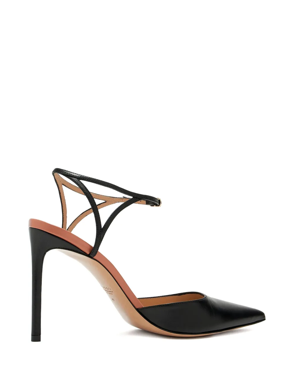 Черные кожаные туфли с острым носком и каблуком-шпилькой, застежка на щиколотке с ремешком и пряжкой