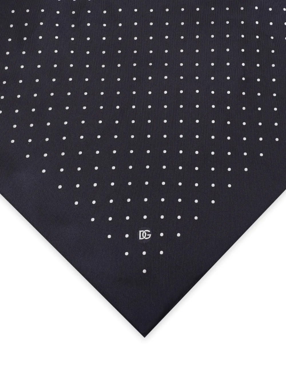 Темно-синий, шелк, принт в горох, логотип спереди, обработанные края и квадратная форма.