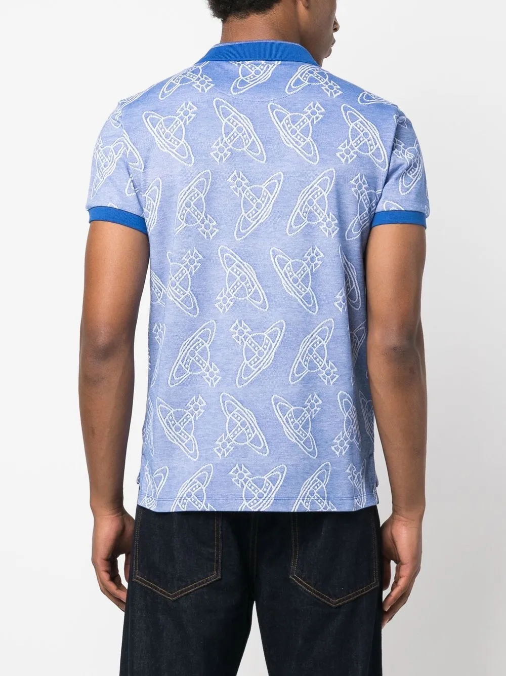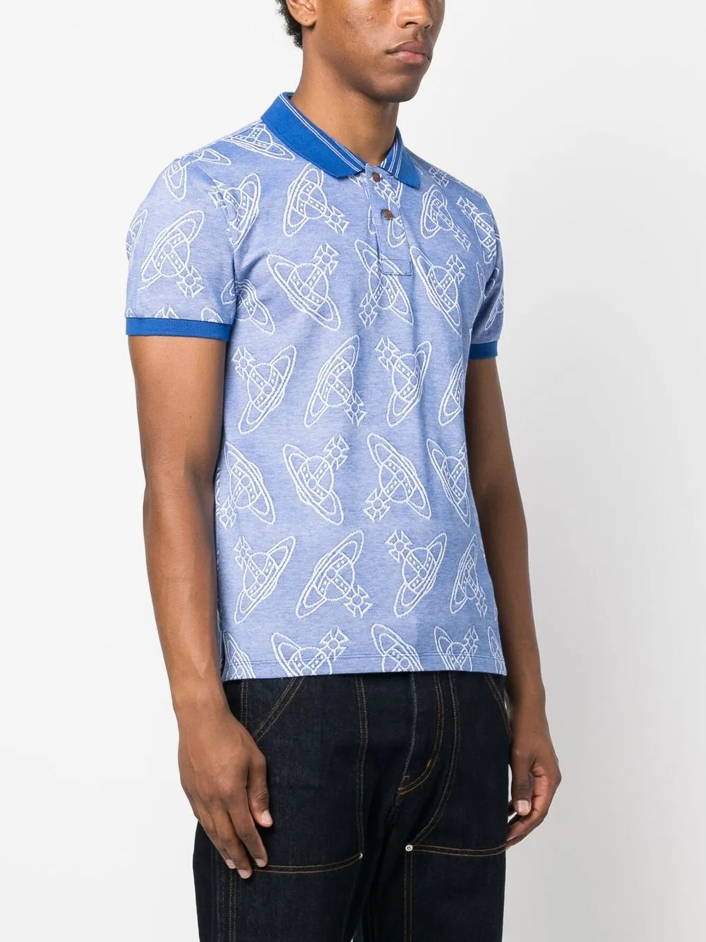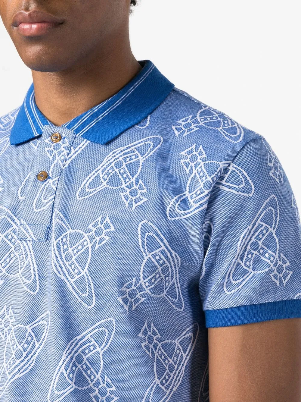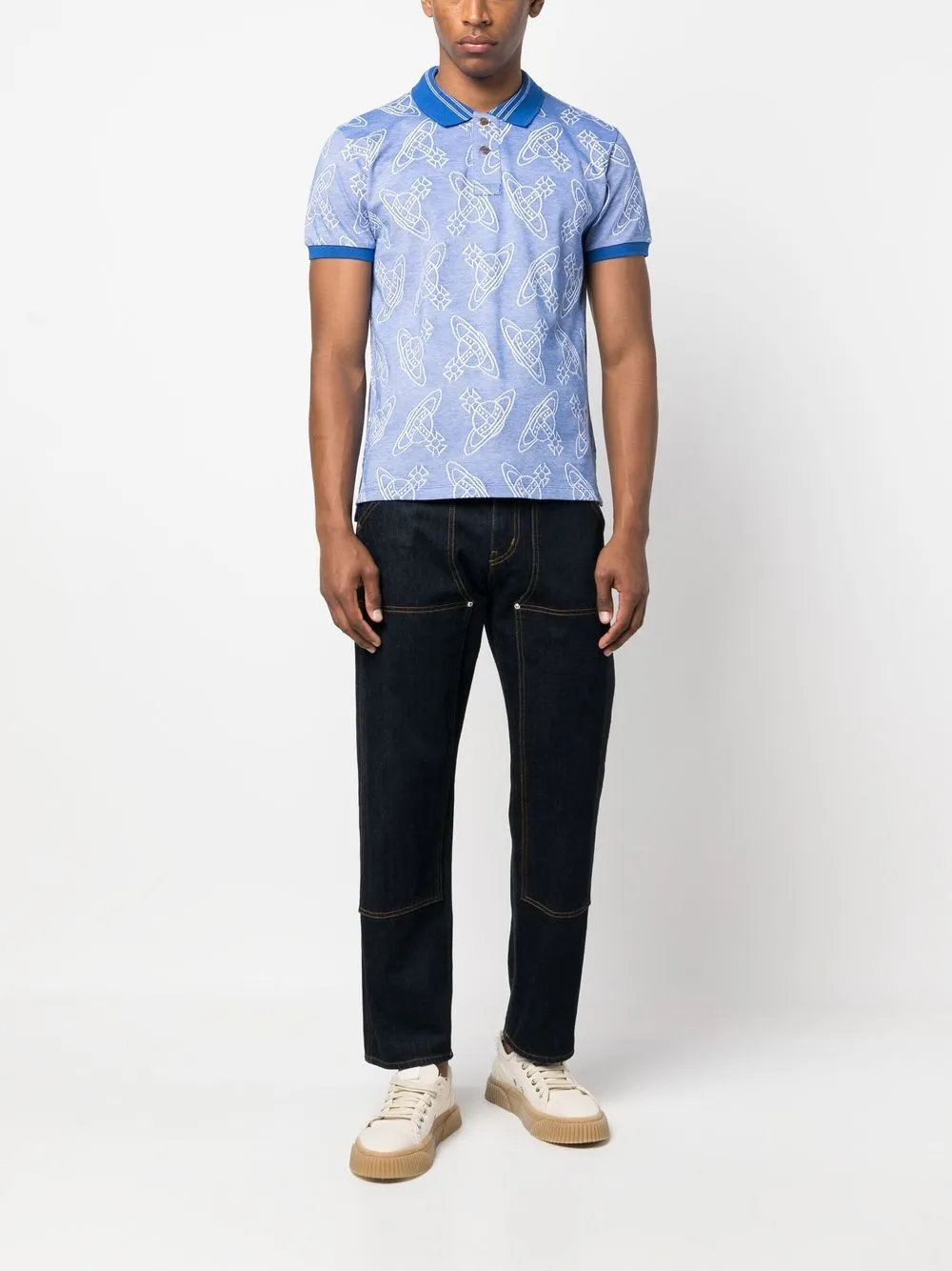 Синий, хлопок, принт с логотипом в форме державы, воротник поло, планка на пуговицах спереди, короткие рукава и прямой подол. Ответственный выбор: Мы объединились с агентством Good On You, которое оценивает бренды по степени их влияния на животных, людей и планету в целом. Этот бренд минимизирует негативное влияние на окружающую среду, поэтому получил хорошую оценку.