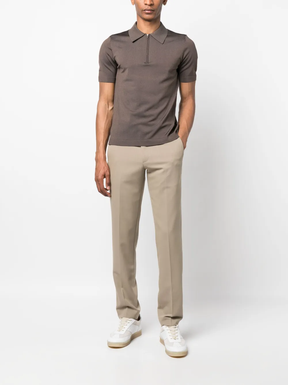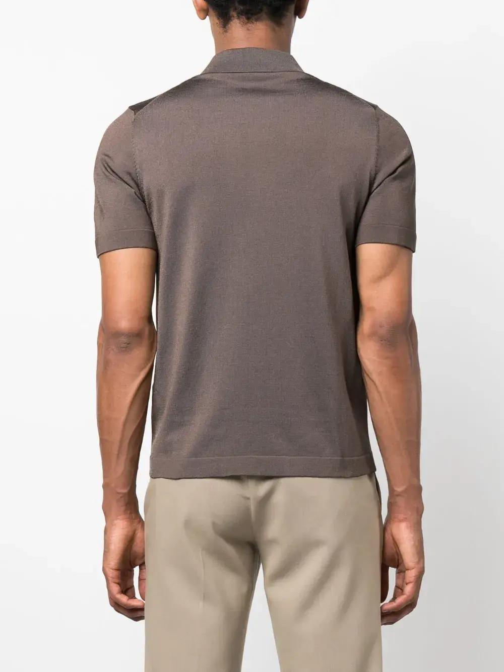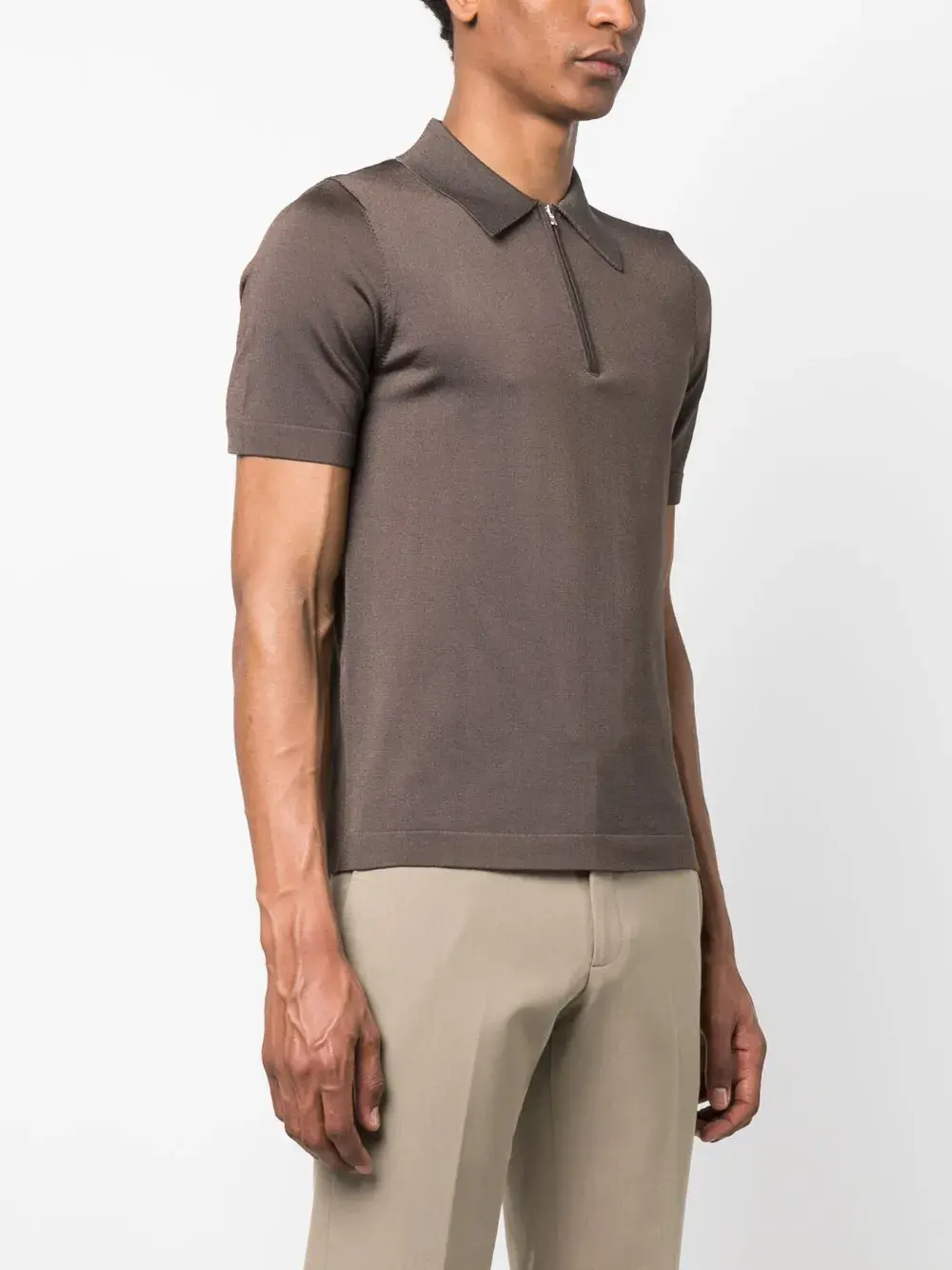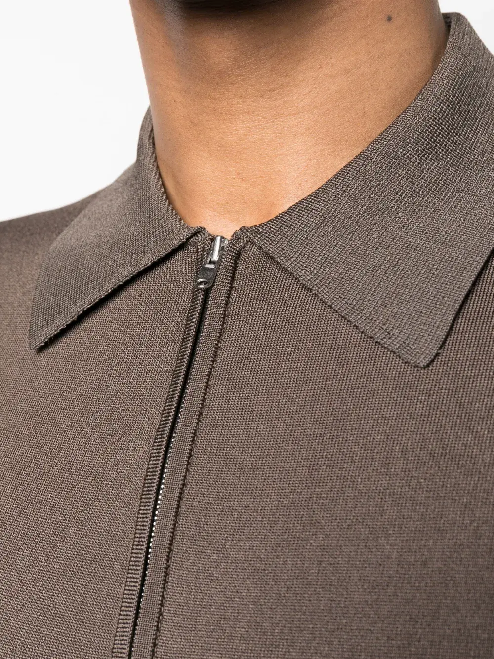 Серо-коричневый, тонкая вязка, воротник поло, короткая застежка на молнии спереди, короткие рукава и прямой подол.
