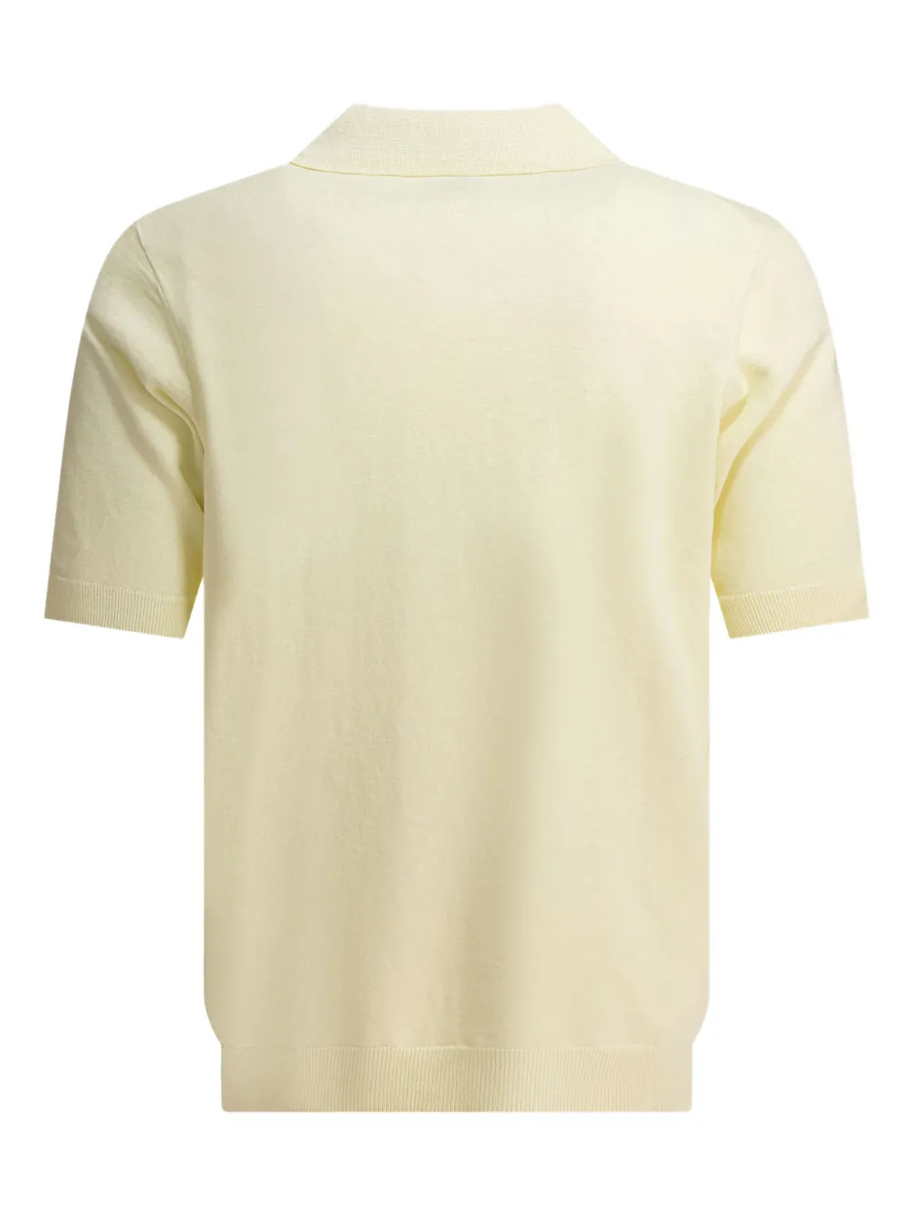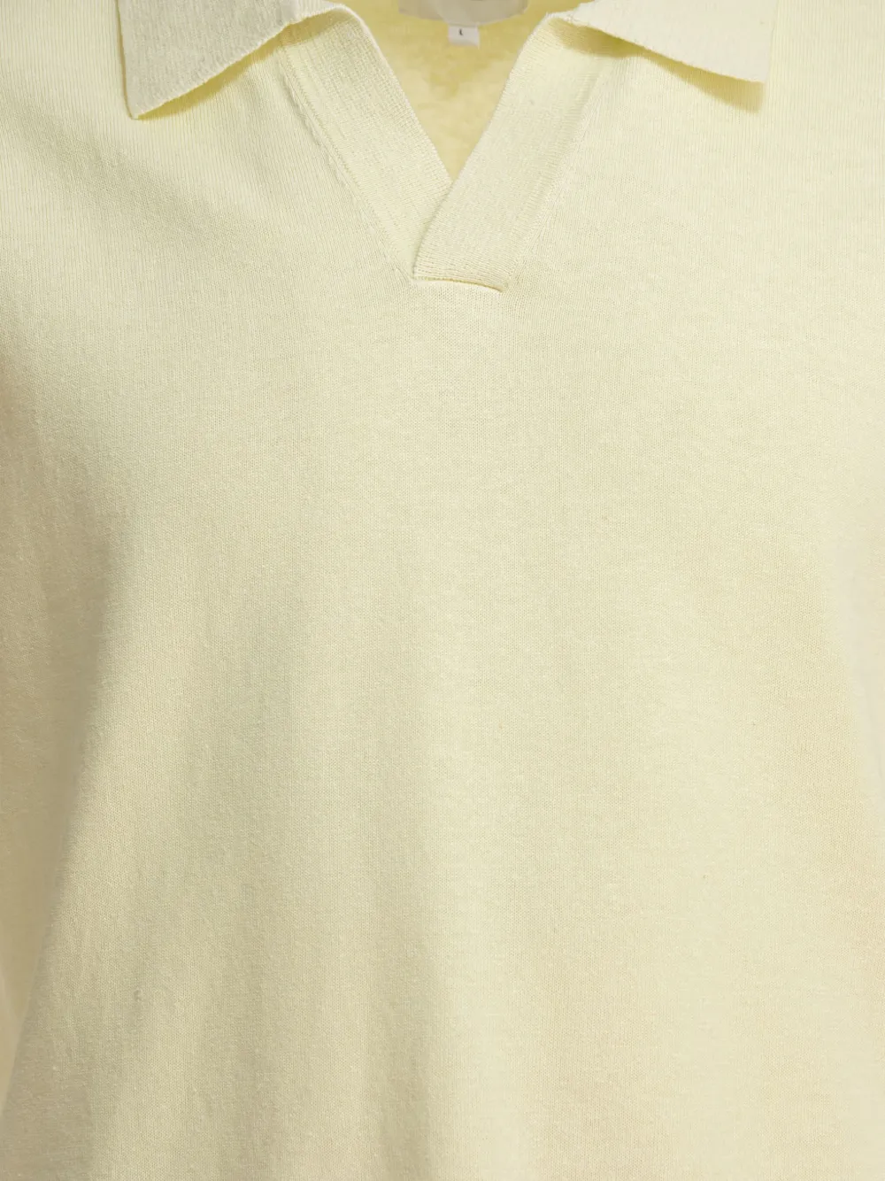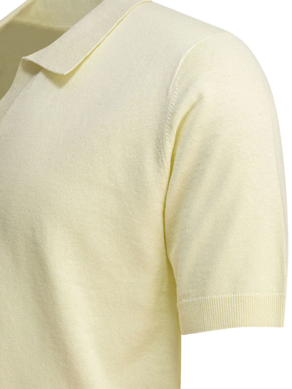 Бледно-желтые короткие рукава, ребристые отделки, V-образный вырез, воротник-поло.