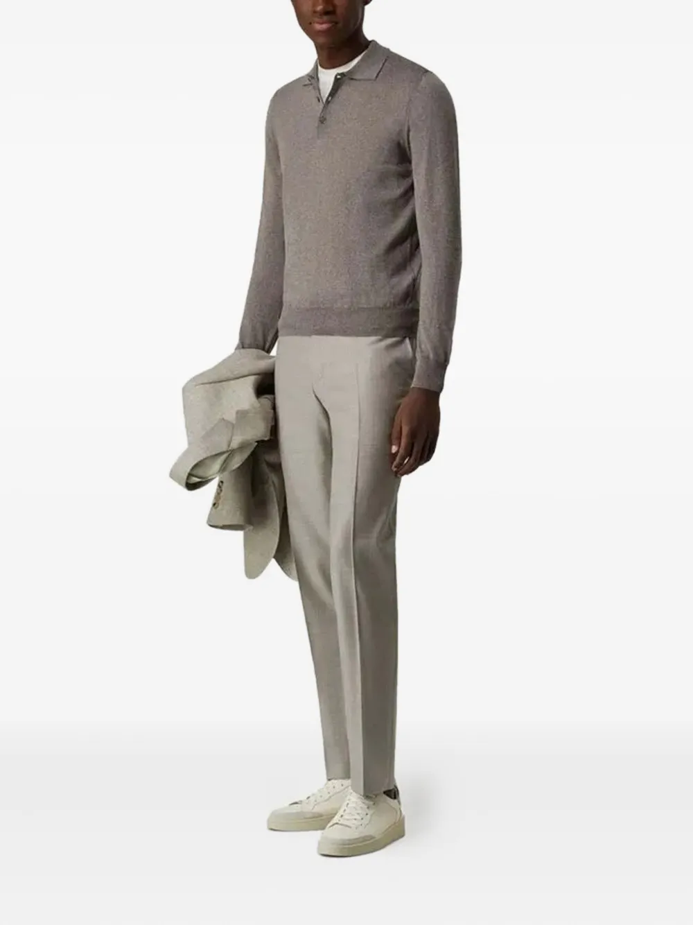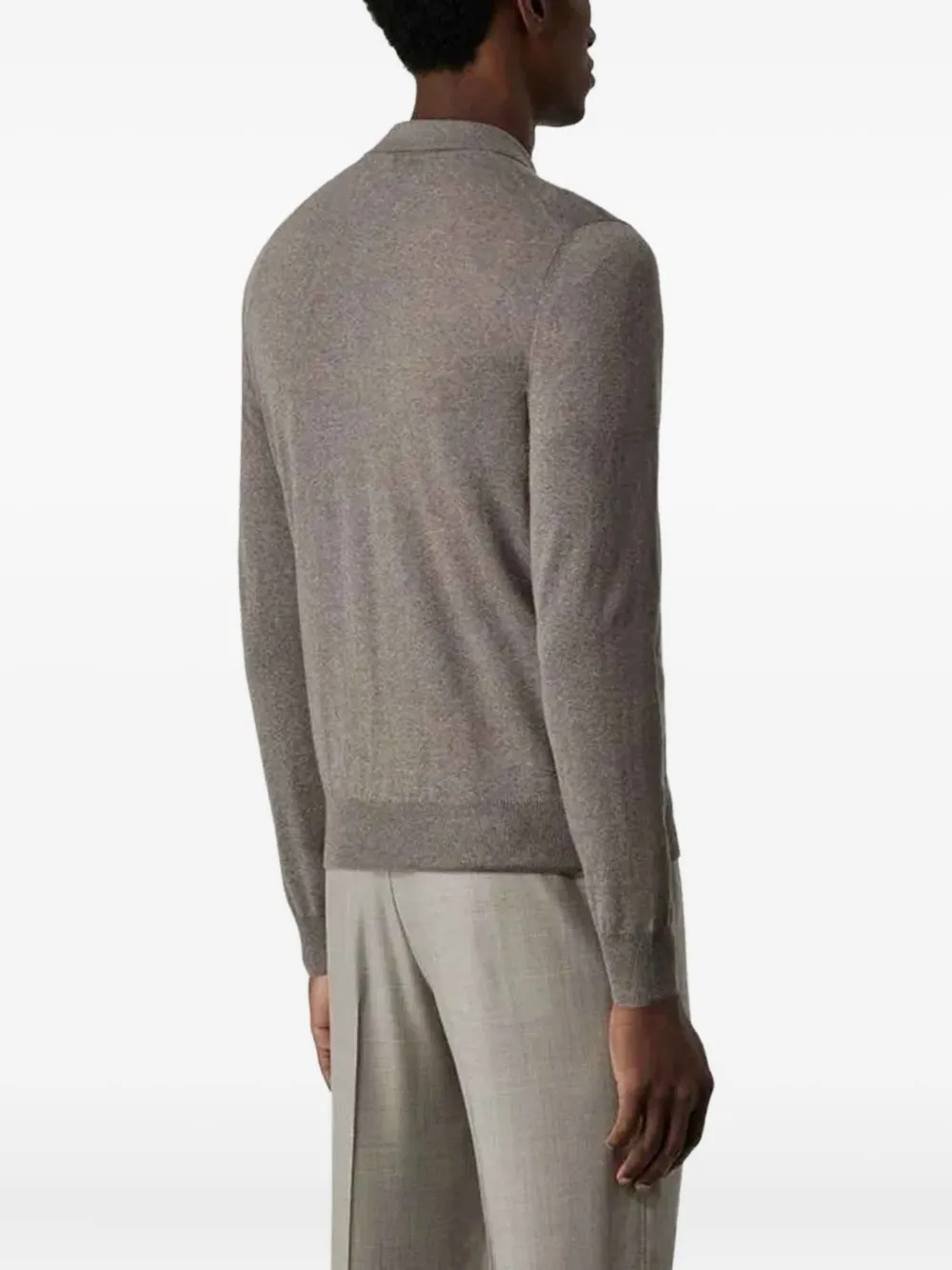Серый ворот поло, длинные рукава, застежка на пуговицы, ребристый край
