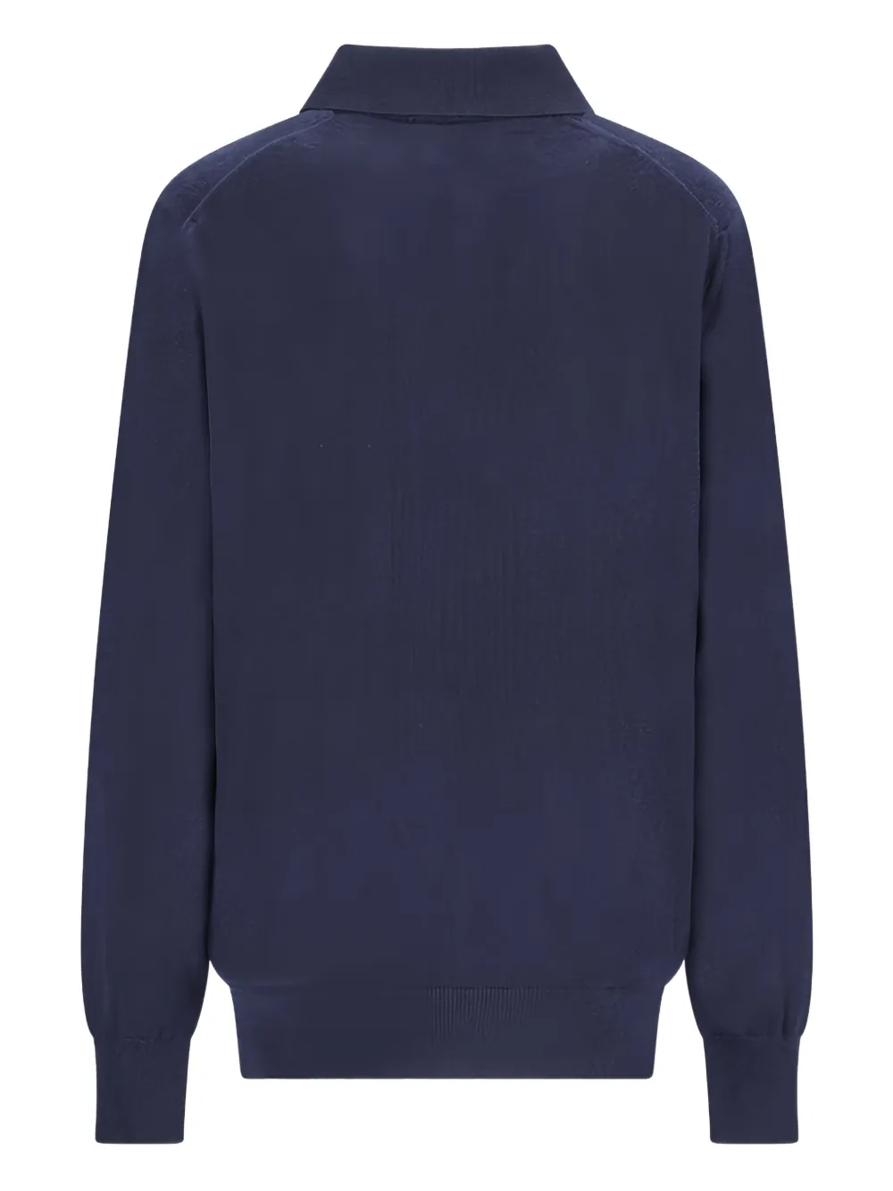 Темно-синяя водолазка с длинными рукавами, застежкой на пуговицы, ребристыми манжетами и подолом.