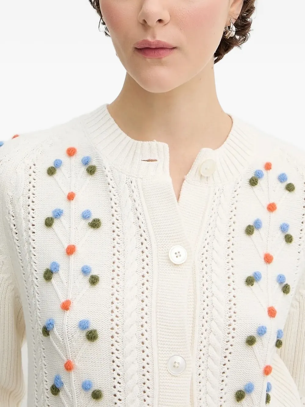 Белоснежный трикотаж с помпонами, застежка на пуговицы, ребристые манжеты