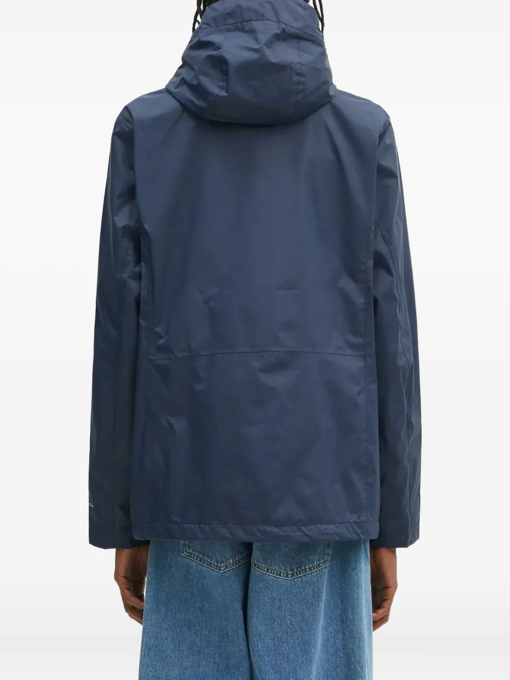 Темно-синий пришитый капюшон, застежка-молния, регулируемые манжеты, боковые карманы.