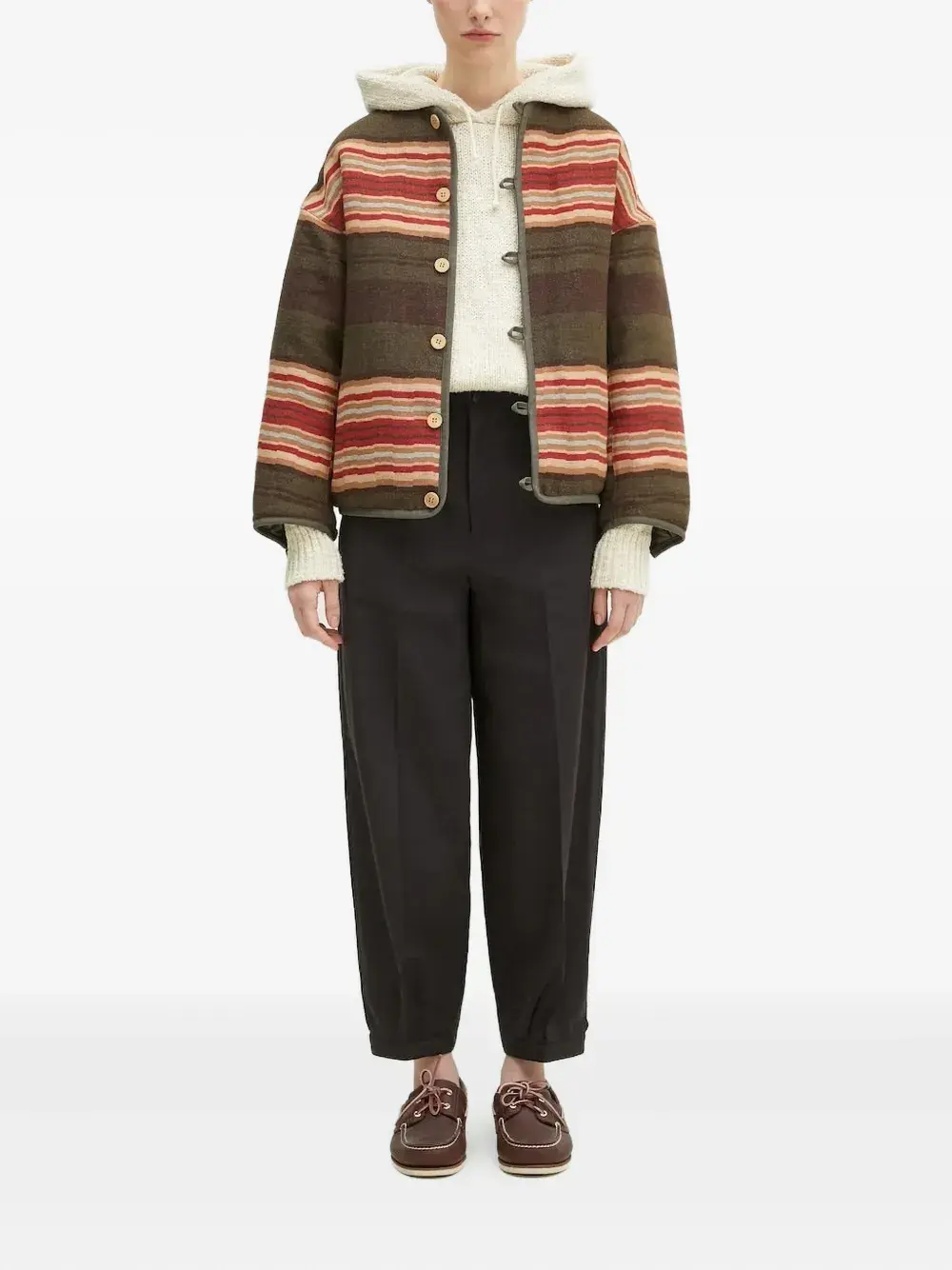 Черные заутюженные складки на манжетах, застегивающиеся на пуговицы, высокая талия, зауженные штанины