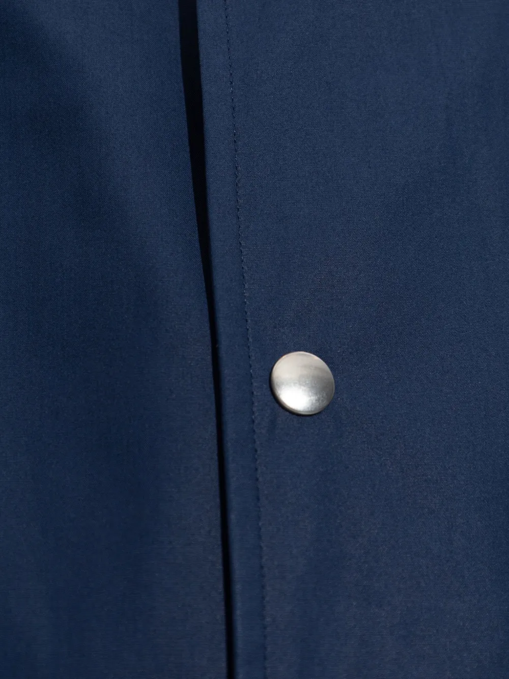 Темно-синий хлопковый жакет, застежка на кнопки, боковые карманы, классический воротник, логотип на спине, длинные рукава, прямой подол