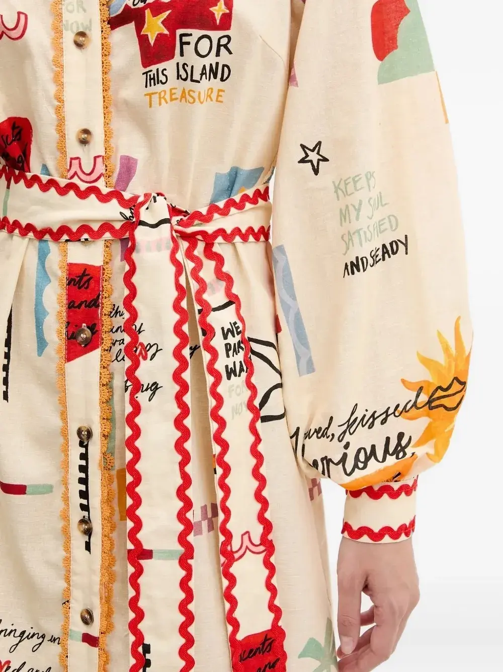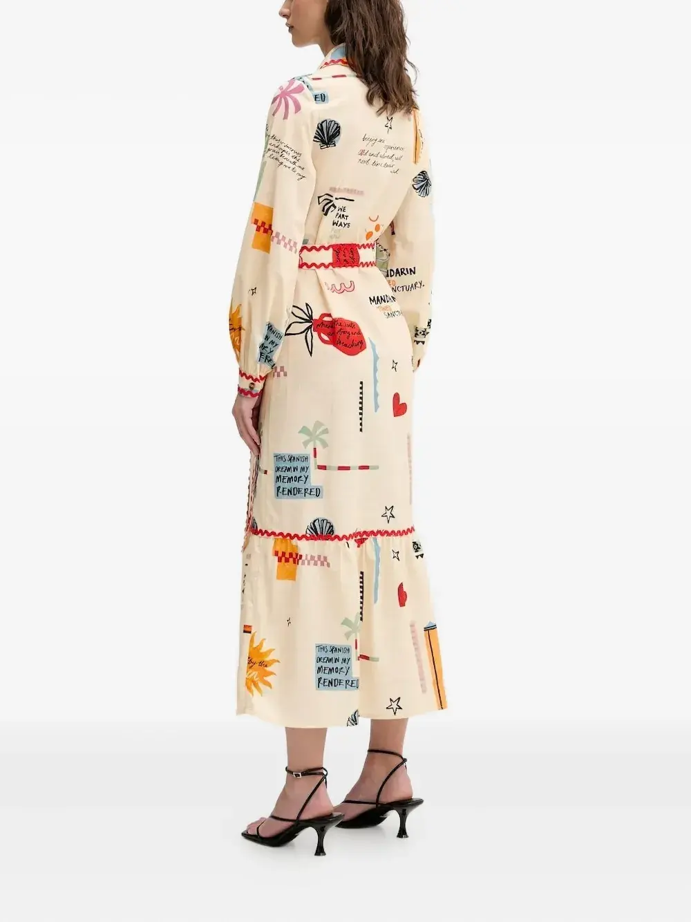 Кремовый абстрактный принт, отделка оборкой, длинные рукава, застежка на пуговицы, пояс с завязками.