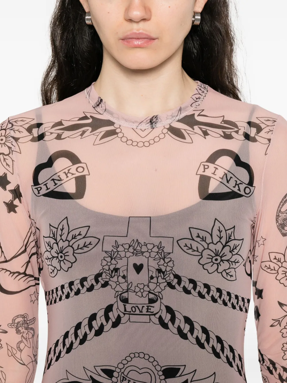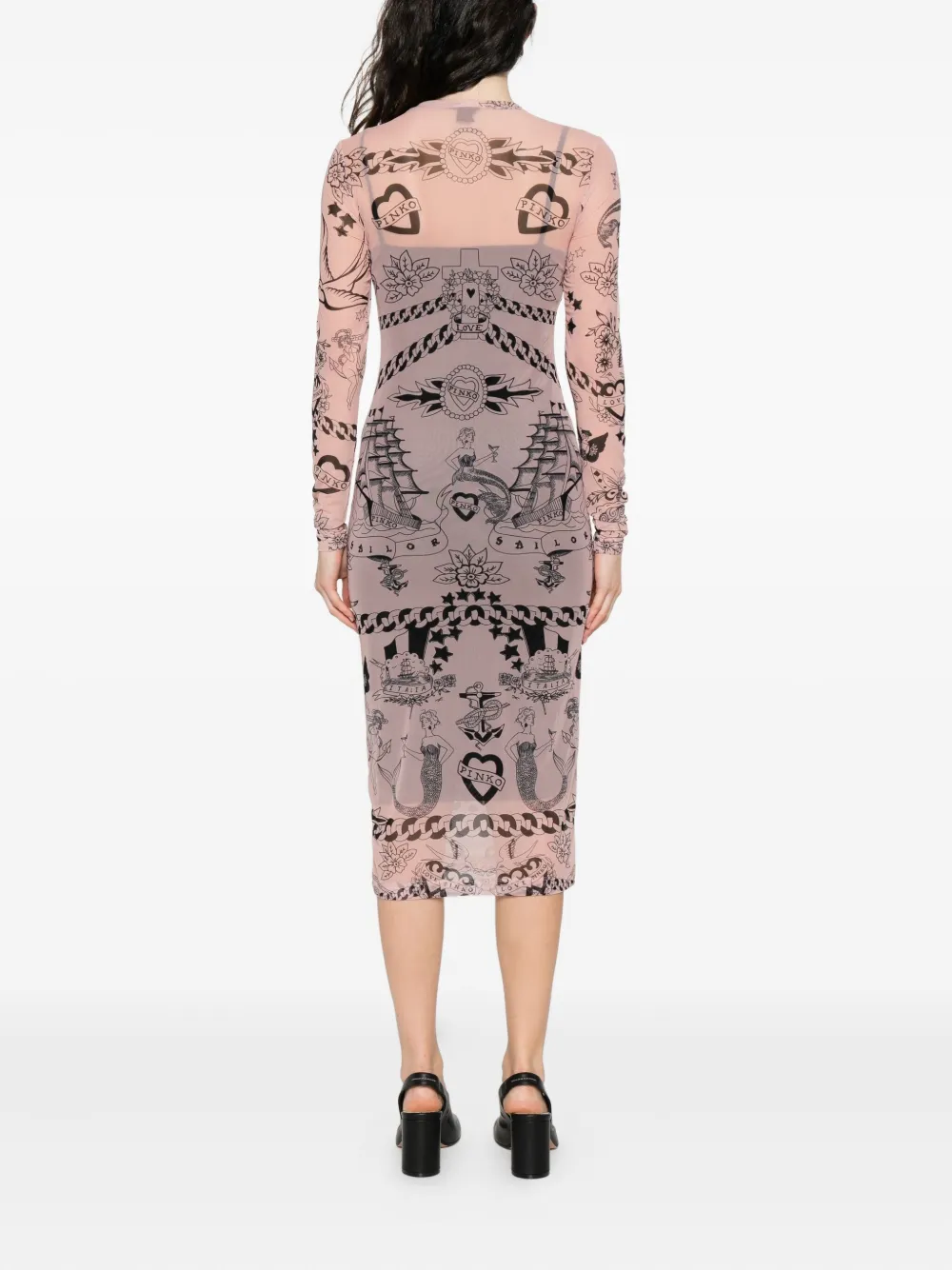 Платье-комбинация с принтом татуировки, длинными рукавами и круглым вырезом внутри, нежно-розового цвета