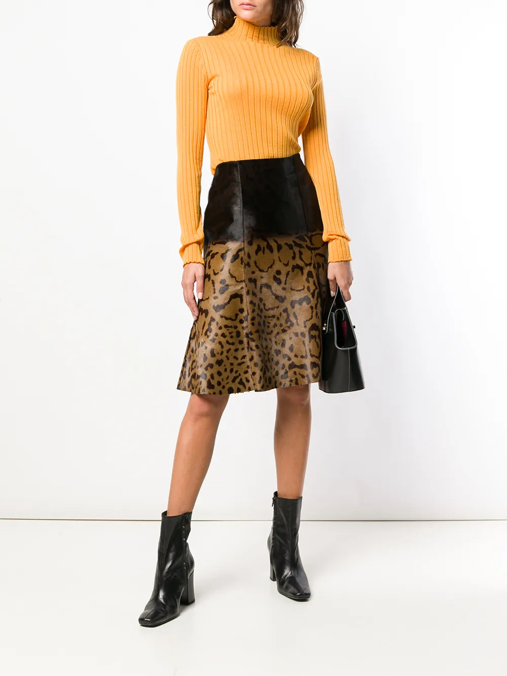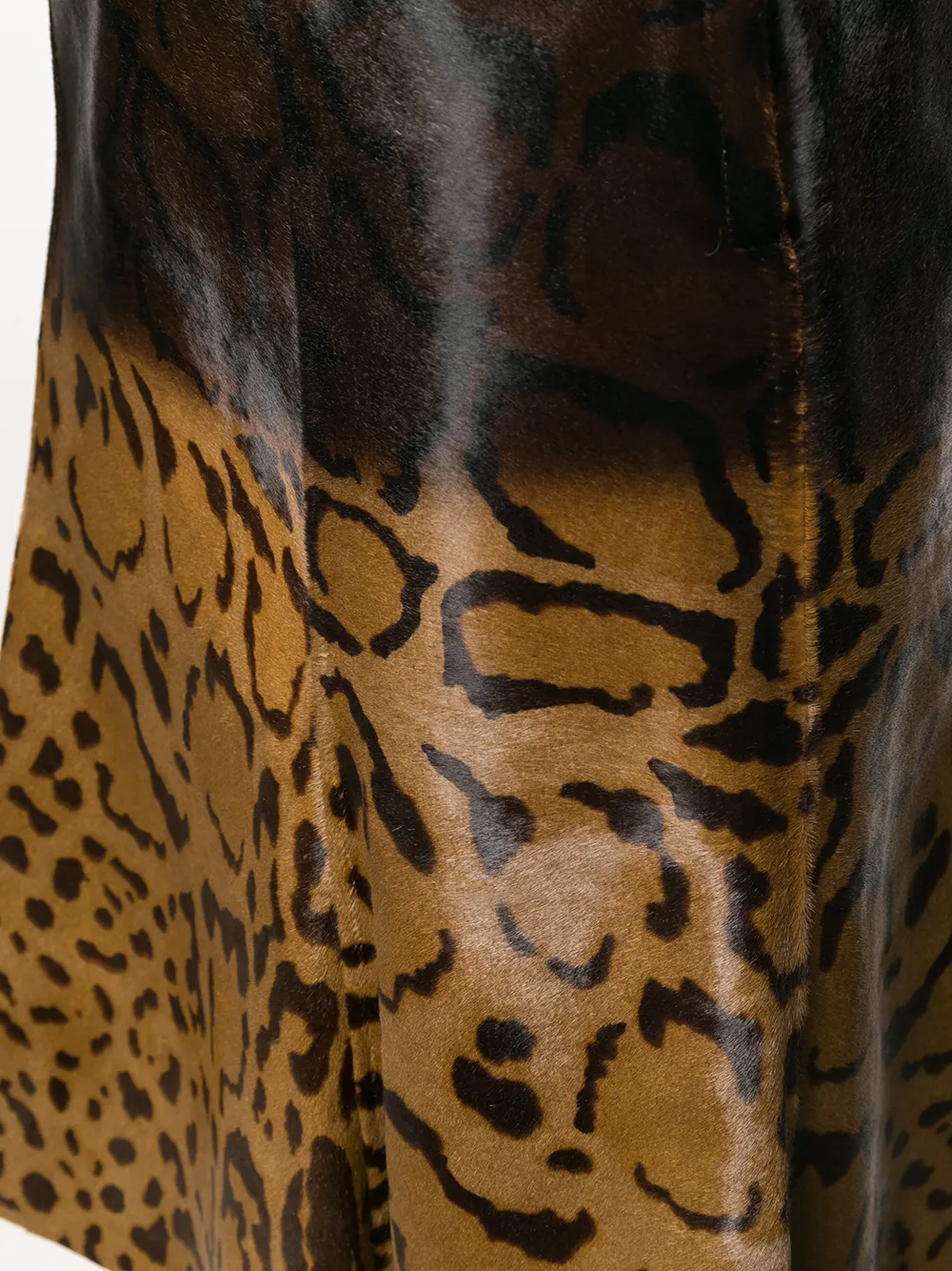 Коричневая с бежевым из телячьей кожи юбка миди с принтом от Salvatore Ferragamo(Сальваторе Феррагамо). Завышенная посадка, А-образный силуэт, длина по колено, потайная застежка на молнии сзади.