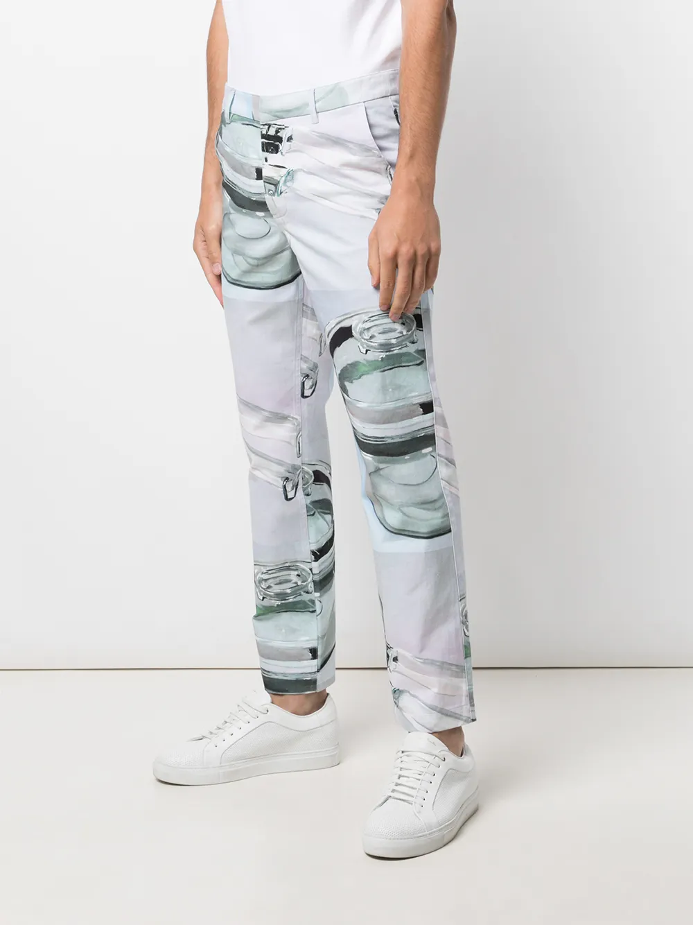 Абстрактный принт, петли для ремня, потайная застежка спереди, прямой крой и два прорезных кармана по бокам.