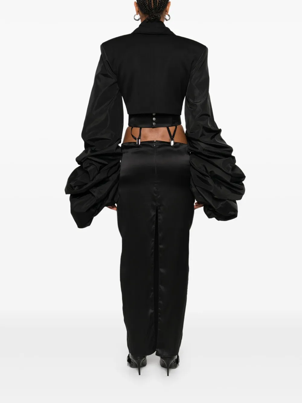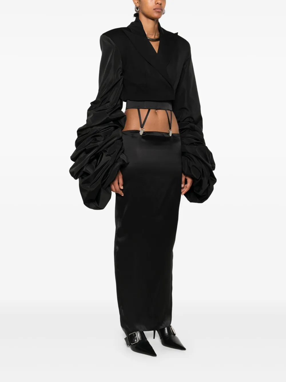 Черные рукава-фонарики, завязка по всему телу, укороченная длина, накладные плечи, заостренные лацканы