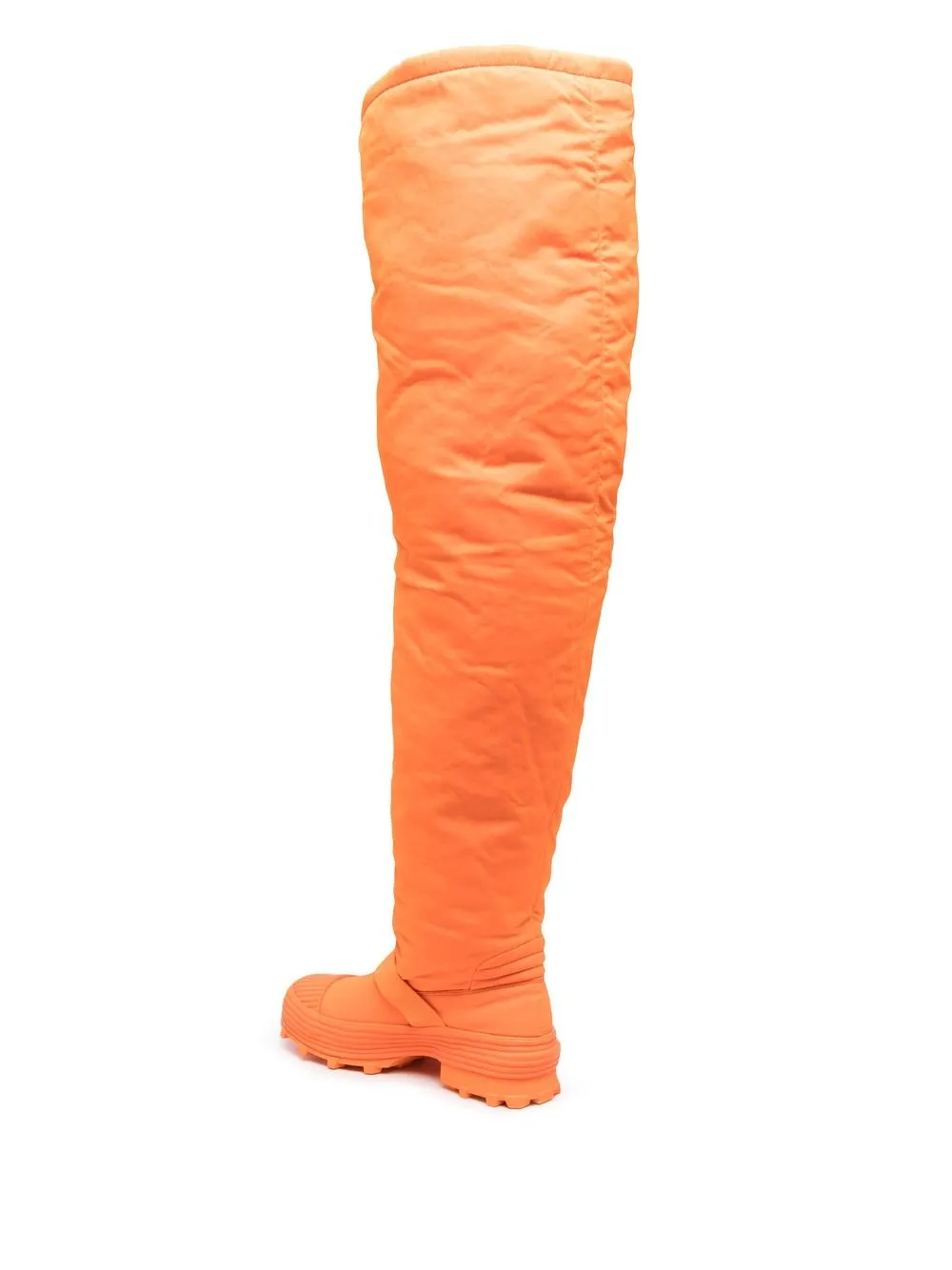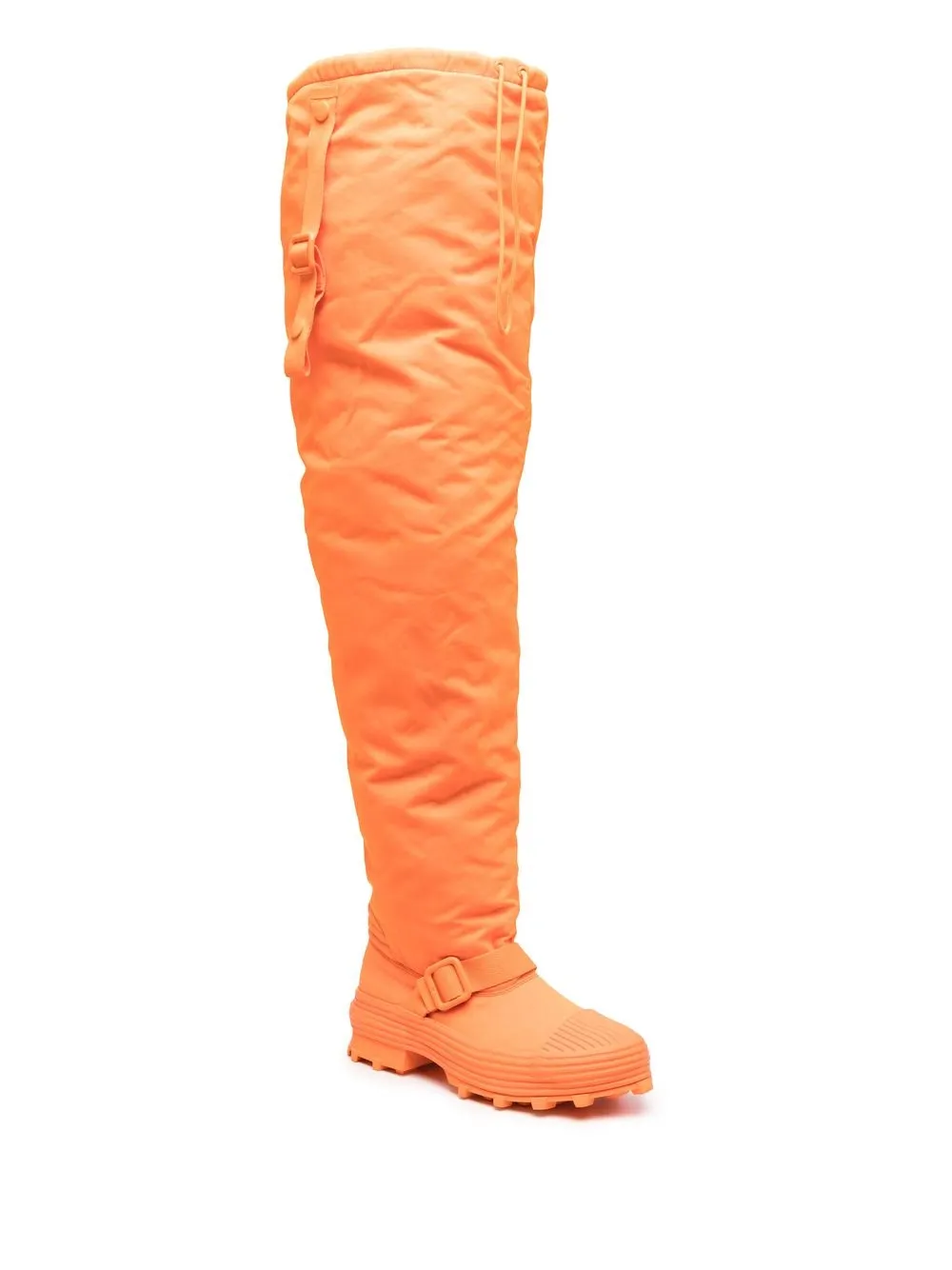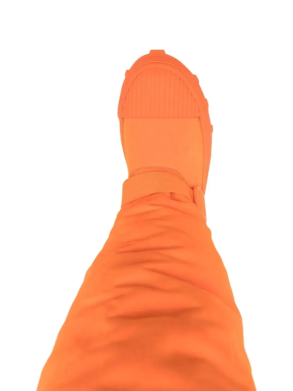 Закругленный носок, ребристая резиновая подошва, регулируемые боковые резинки, ребристая резиновая подошва, длина по колено и застежка на шнурке. Цвет: оранжевый.