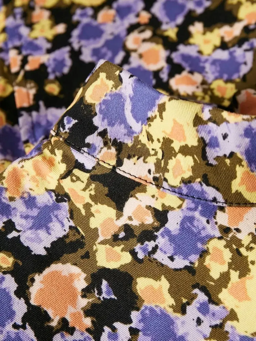 Графический принт с желтыми брызгами, воротник-стойка, рукава три четверти, рукава-буфы