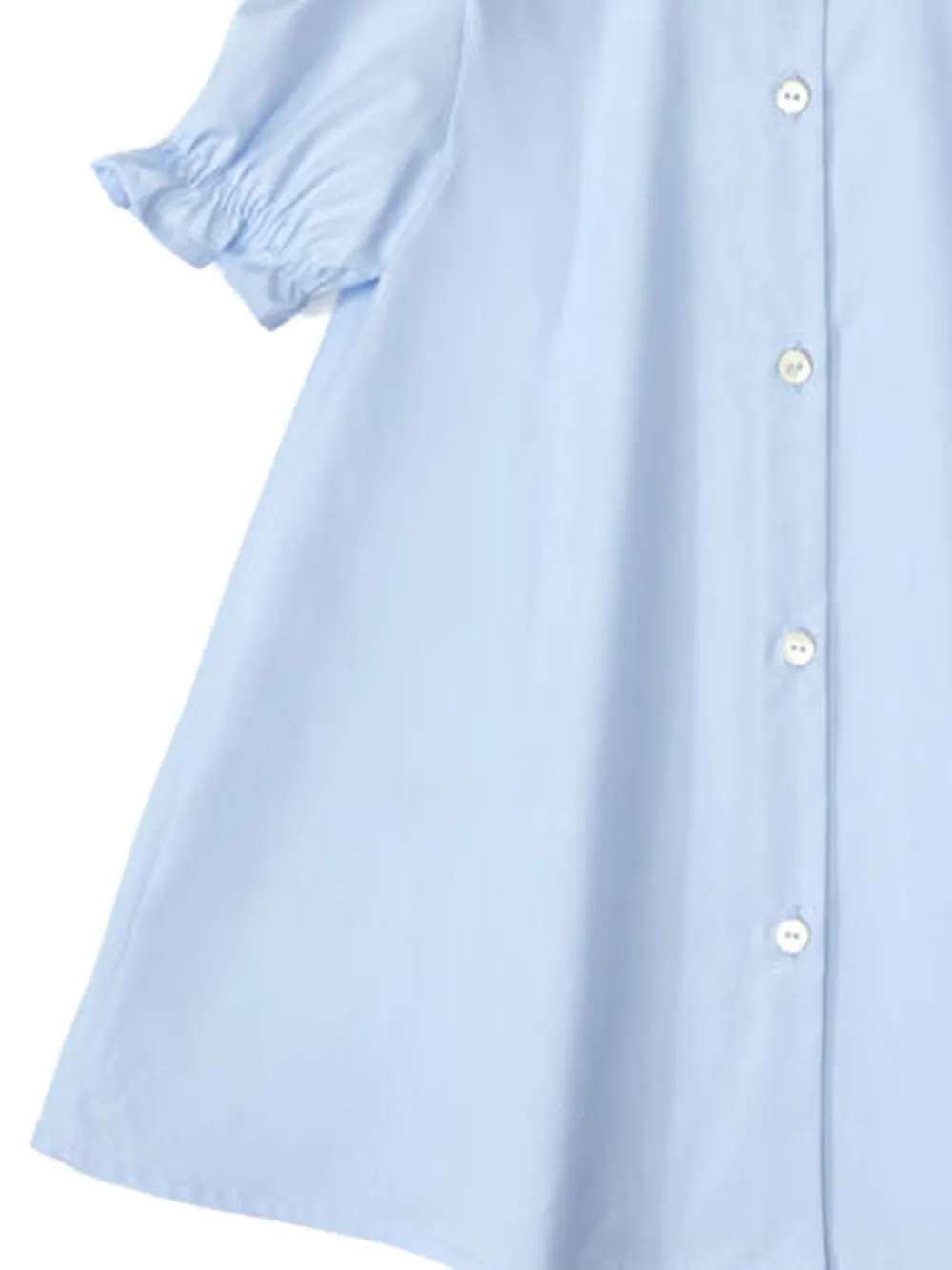 Светло-голубой вышитый логотип, рукава-фонарики, застежка на пуговицы, короткие рукава А-силуэта