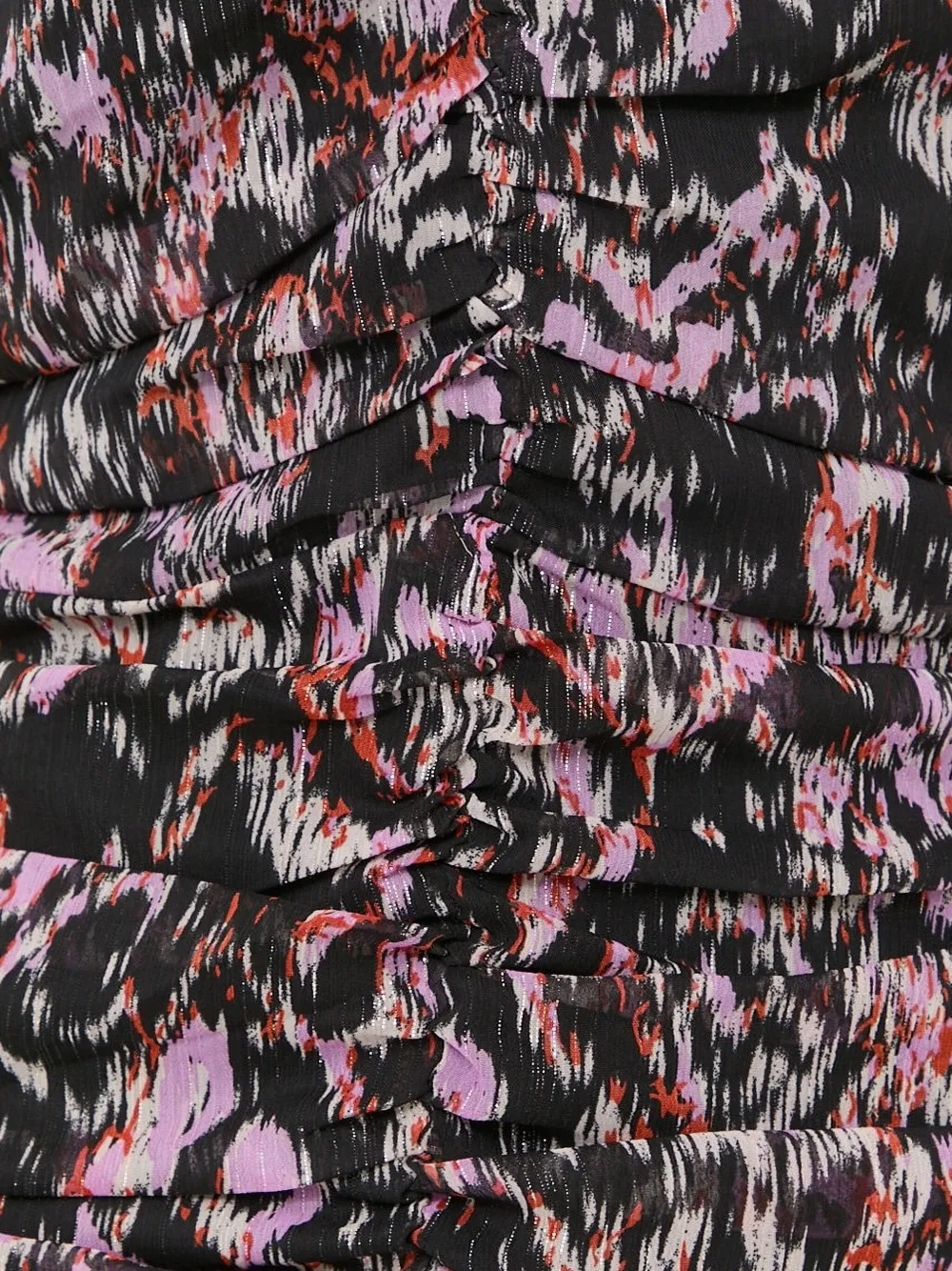 Черный абстрактный принт, лиф со сборками, рукава-фонарики, квадратный вырез, короткие рукава.