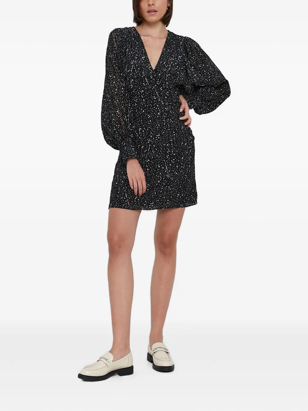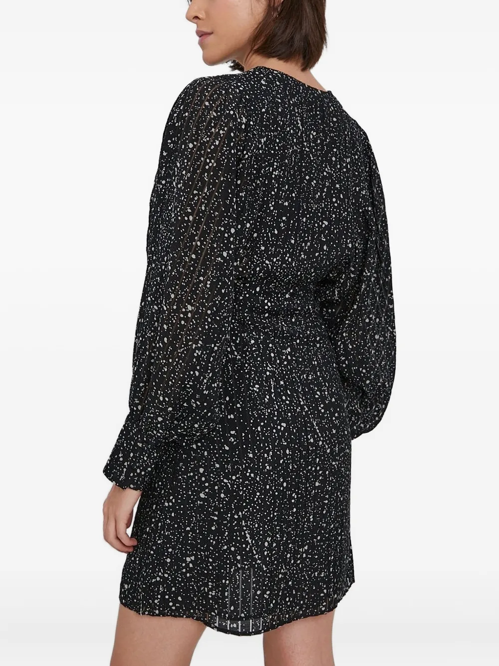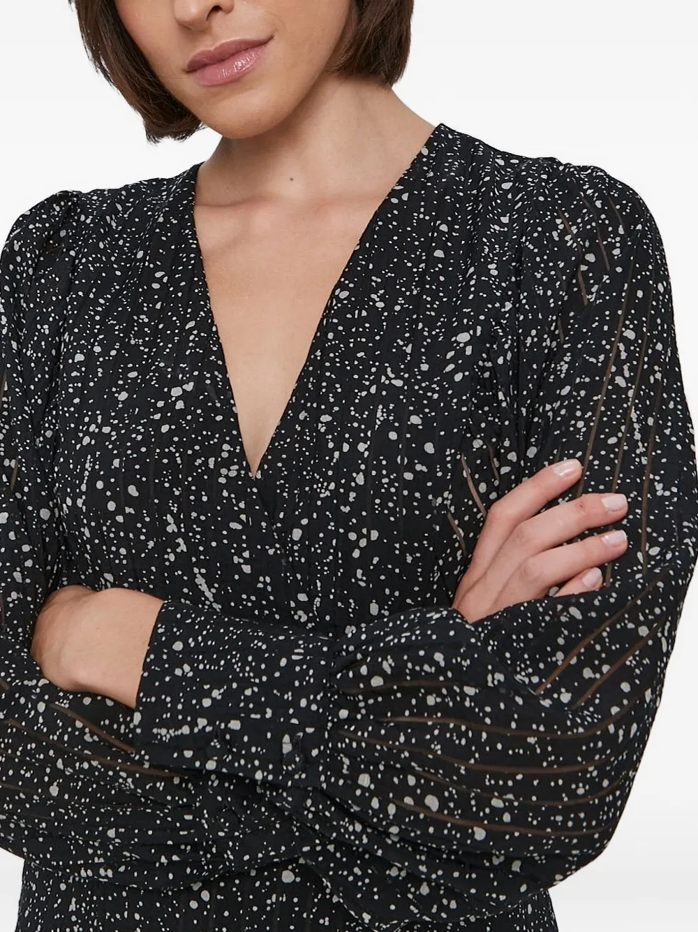 Черный пятнистый принт, V-образный вырез, длинные рукава, рукава-буфы