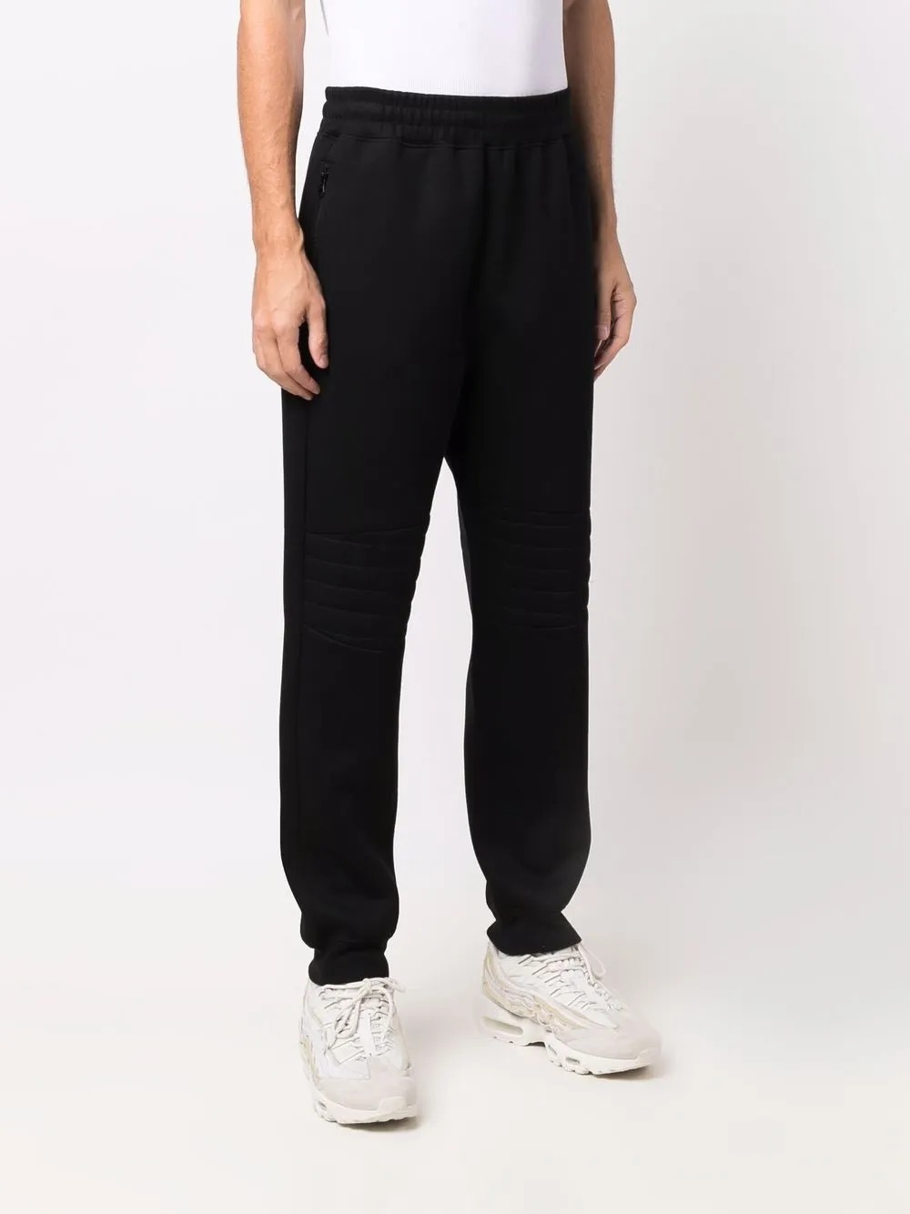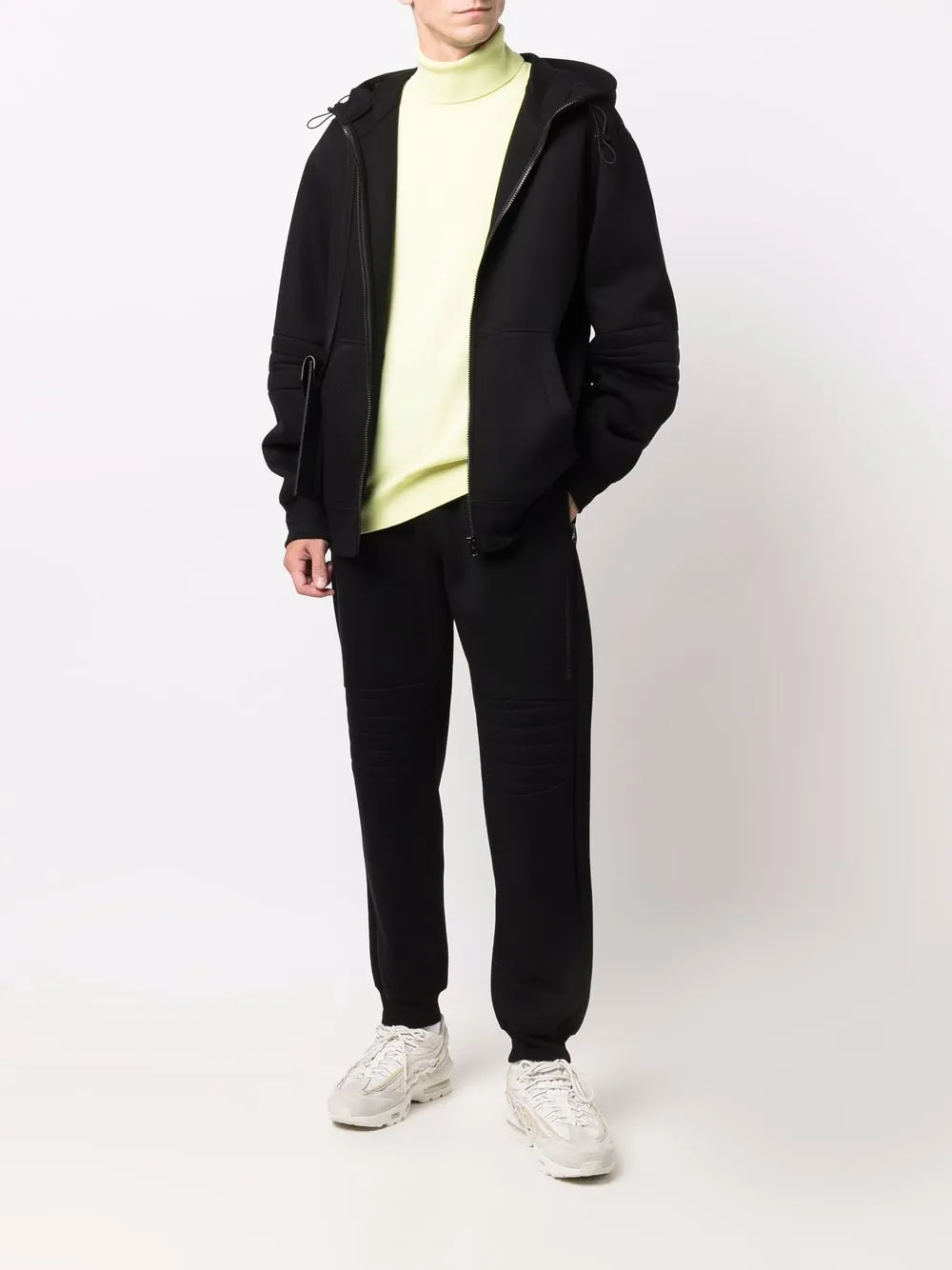 Дутый материал, эластичные манжеты, эластичный пояс и два кармана на молнии по бокам. Цвет: черный.