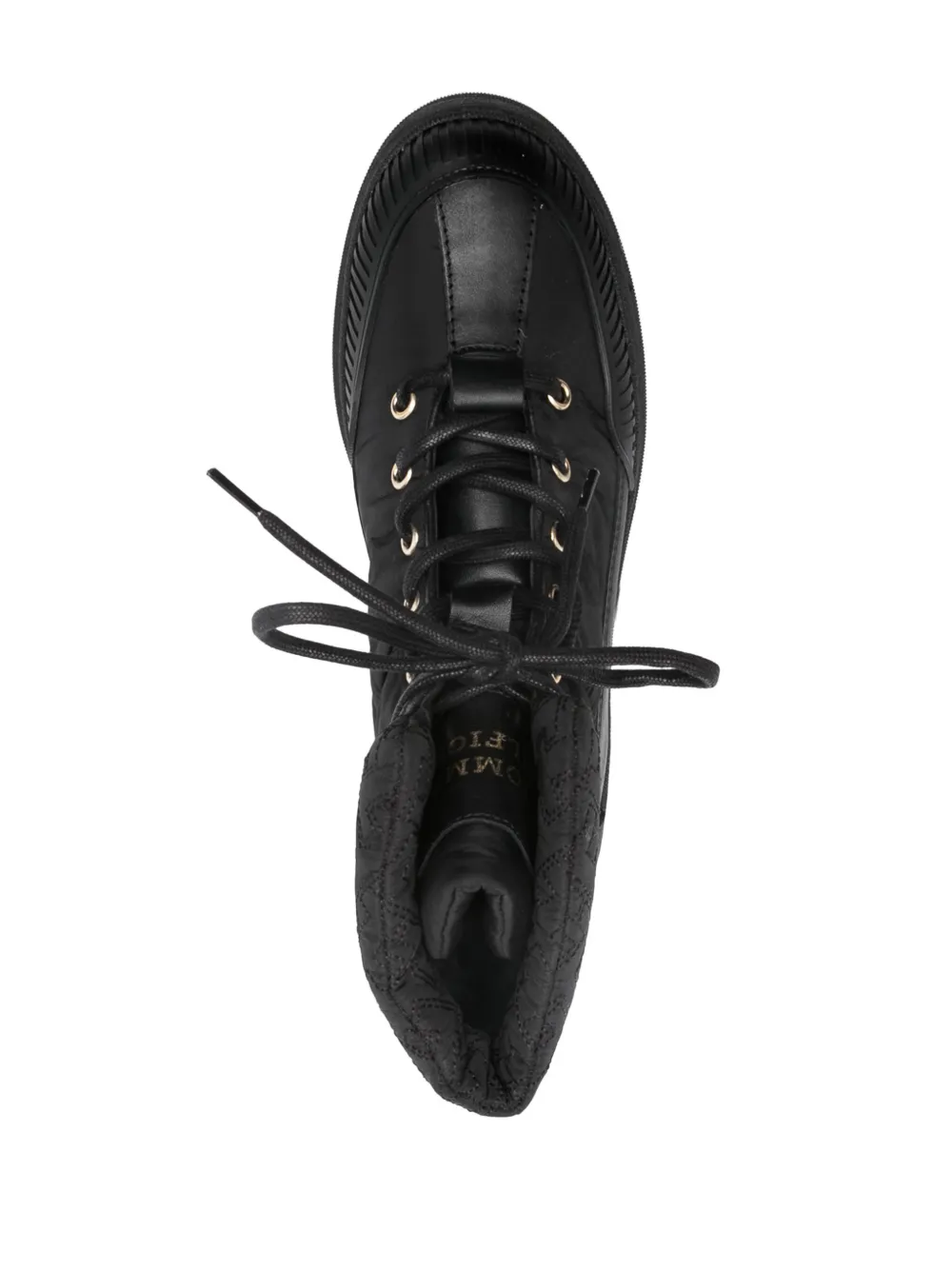 Черный, телячья кожа, вставки, фактурная отделка, нашивка с логотипом на язычке, тисненый логотип сзади, стеганые края, резиновый носок, отделка корсажной лентой, миндалевидный носок, шнуровка спереди, высота по щиколотку и массивная резиновая подошва.