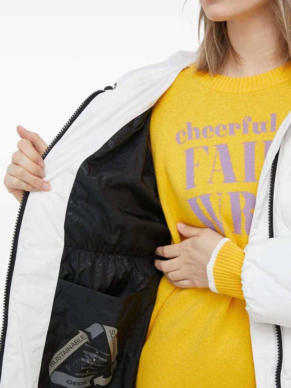 Белая застежка-молния, длинные рукава.