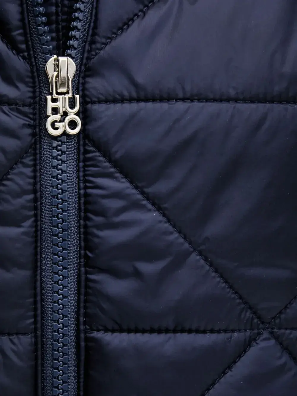 Темно-синяя ромбовидная простежка, застежка-молния, капюшон, длинные рукава, потайная застежка-молния