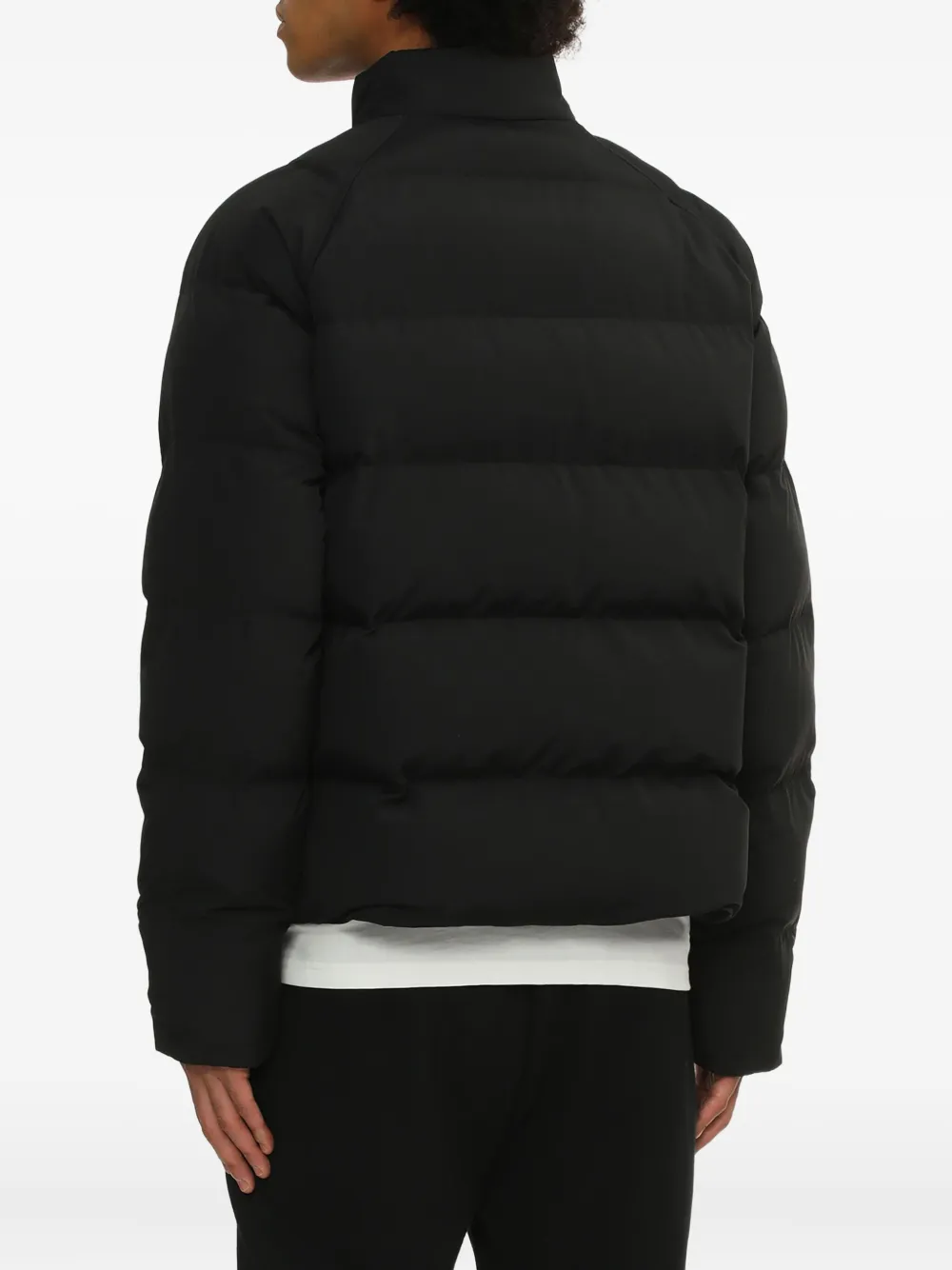 Черная стеганая модель, застежка-молния, рукава реглан, эмблема в виде лаврового венка.