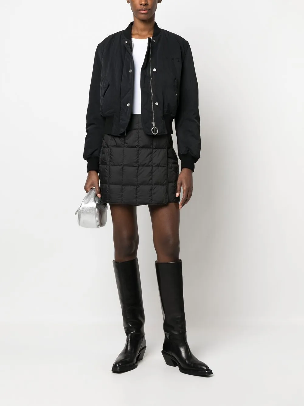 Черный, стеганая модель, завышенная талия и юбка-карандаш.
