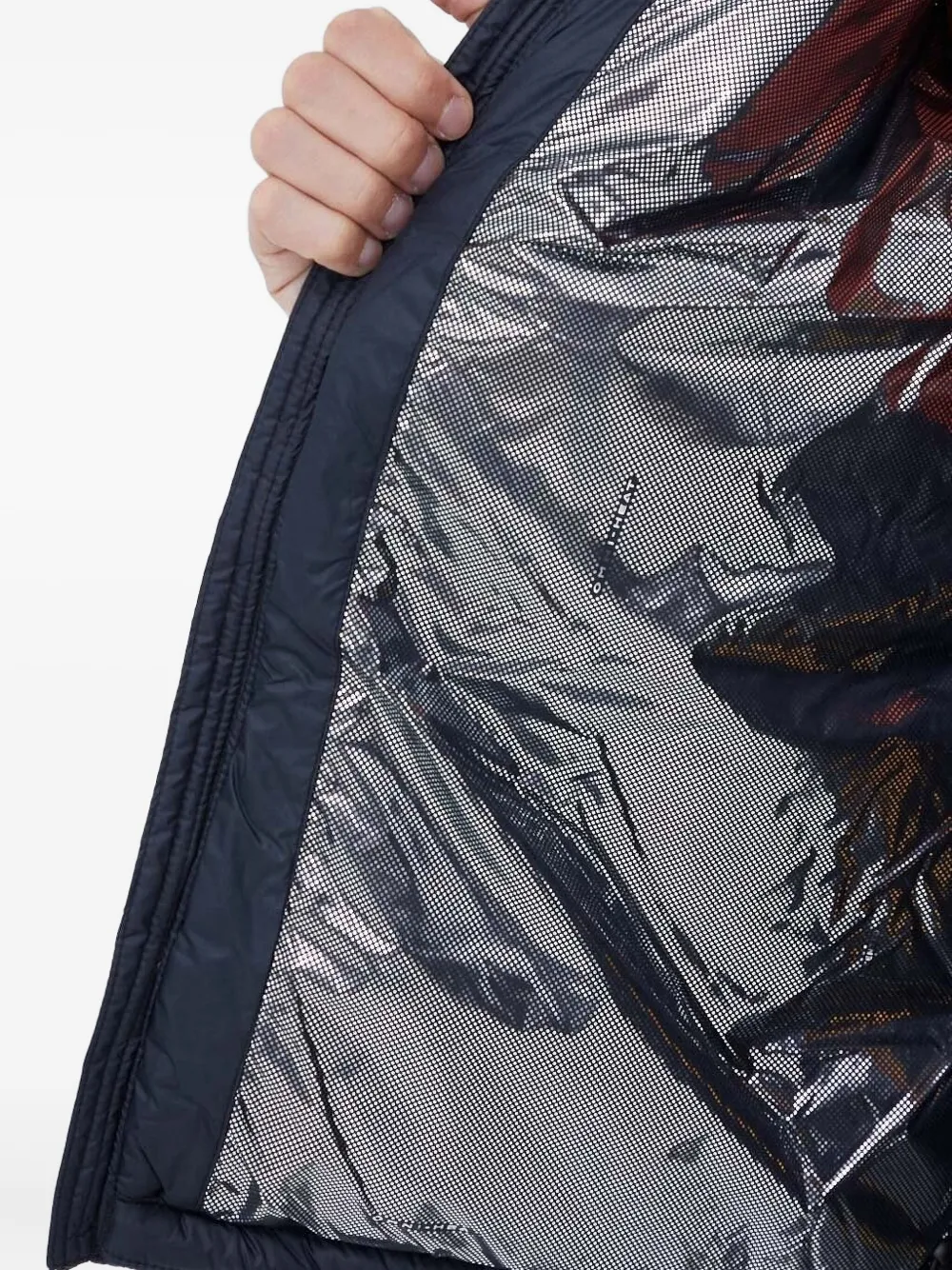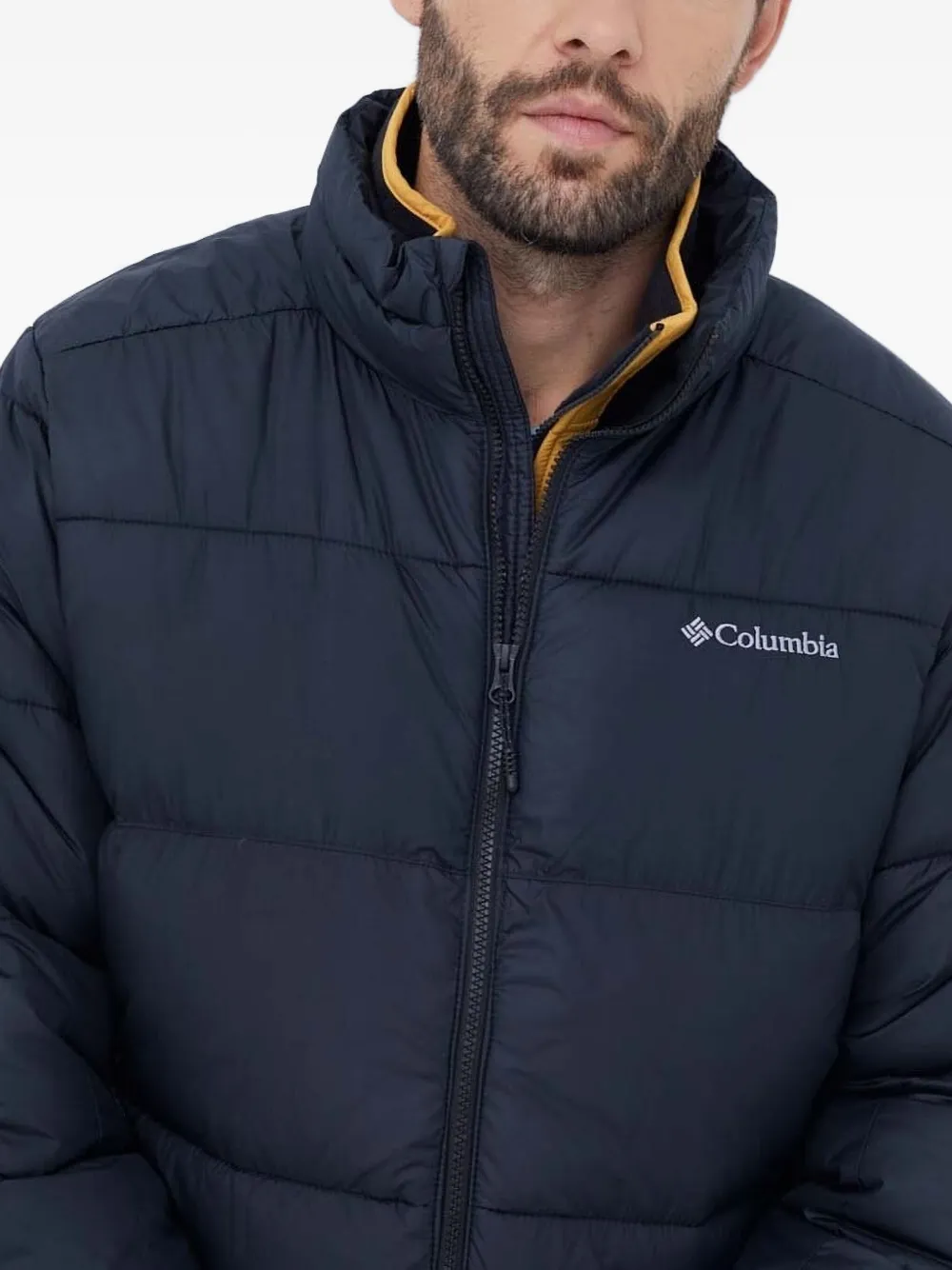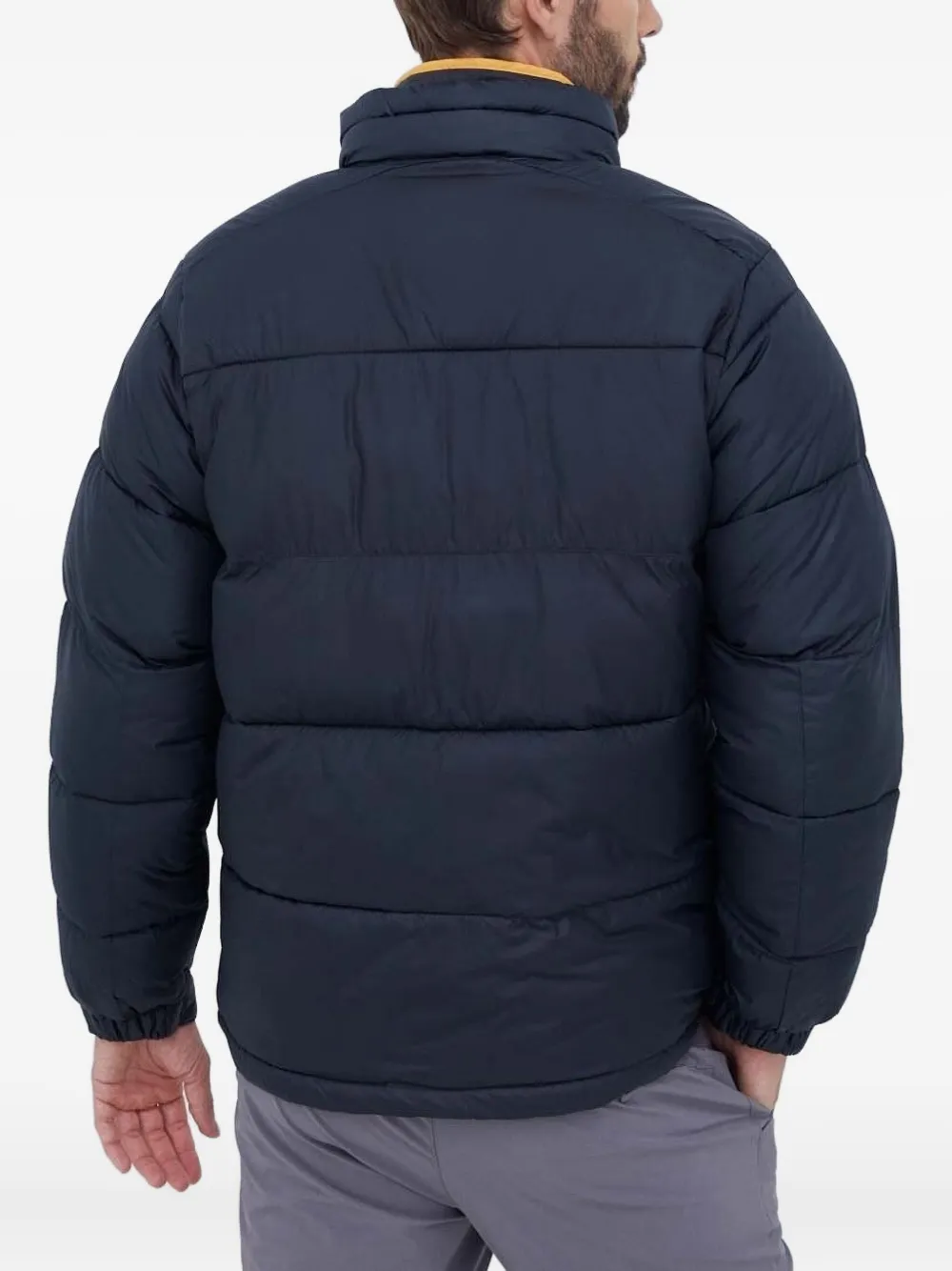 Темно-синий стеганый дизайн, застежка-молния, длинные рукава, вышитый логотип.