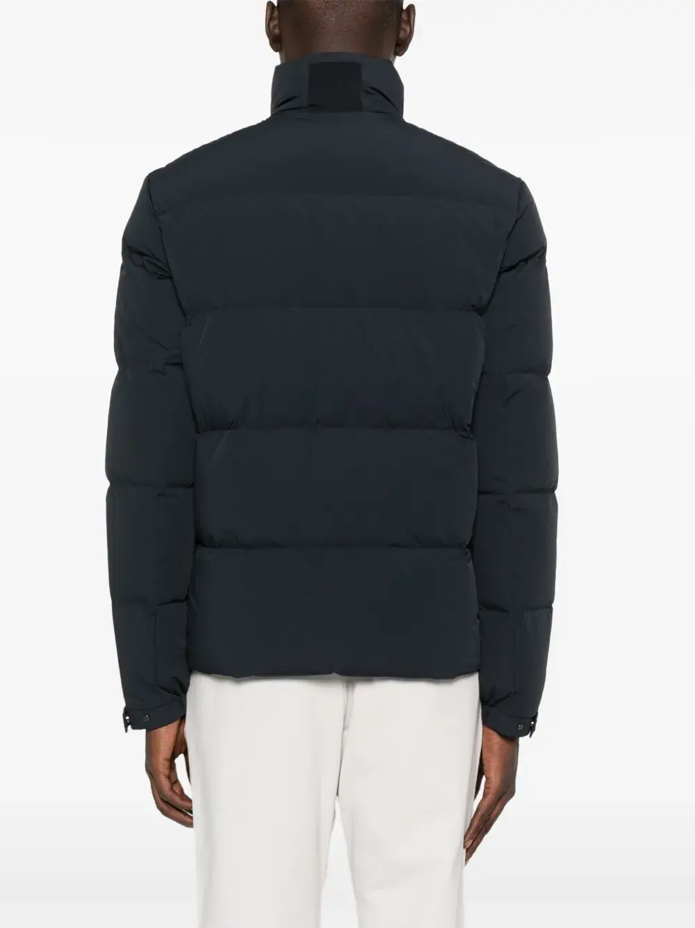 Темно-синяя стеганая застежка-молния, высокий ворот, длинные рукава, передние карманы на молнии.