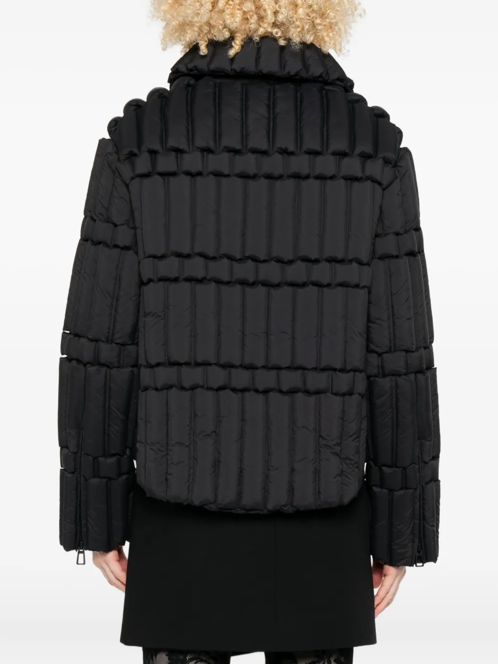 Черная стеганая модель с асимметричной застежкой-молнией и карманами на молнии с воротником.