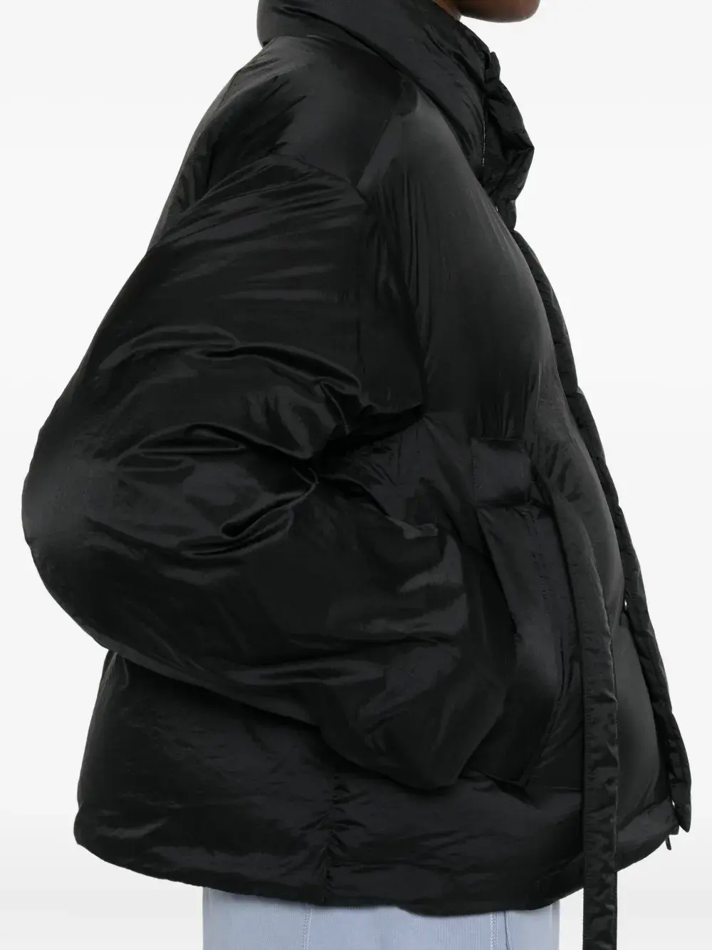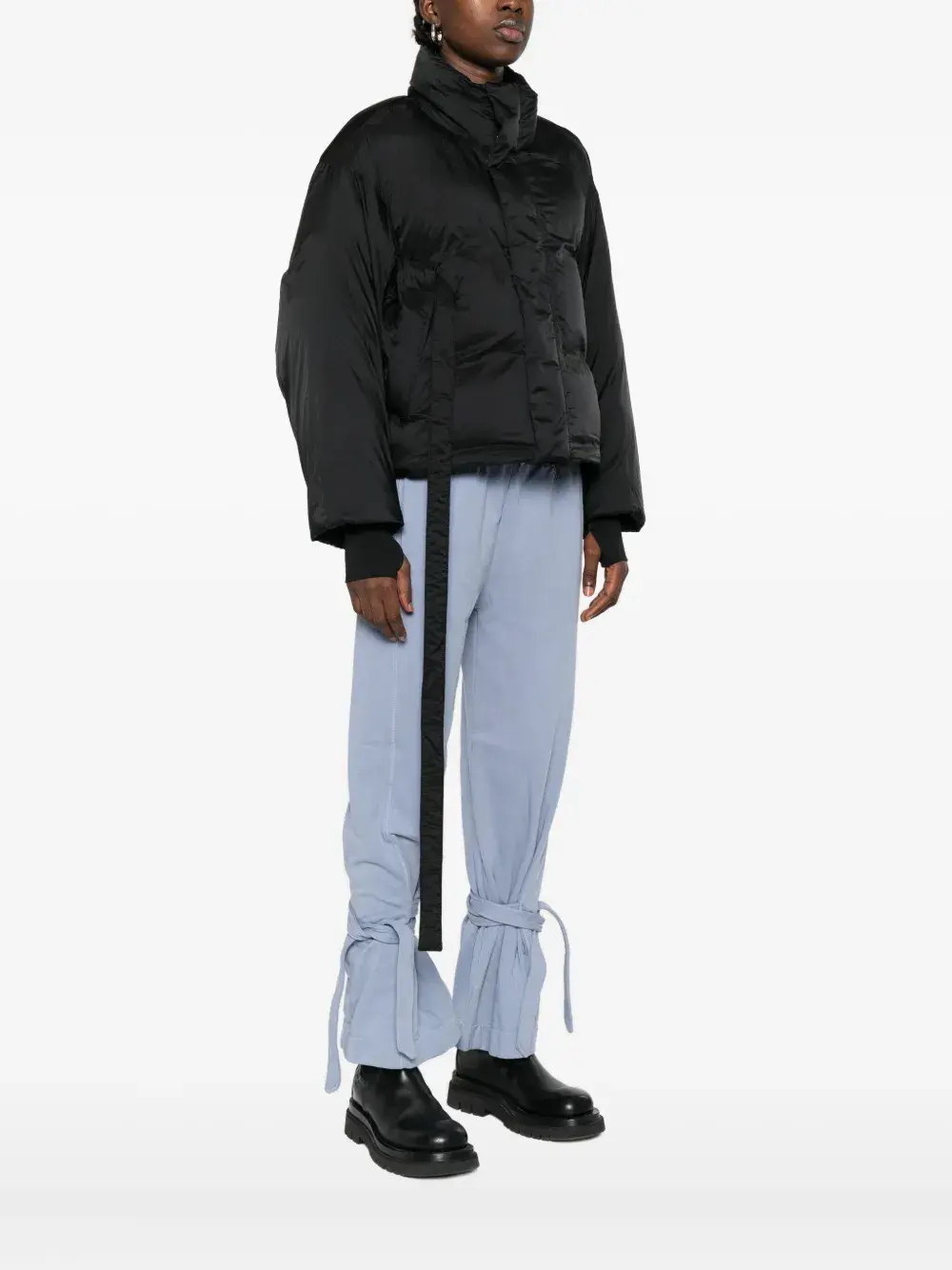 Черный стеганый дизайн с длинными рукавами и поясом на талии.