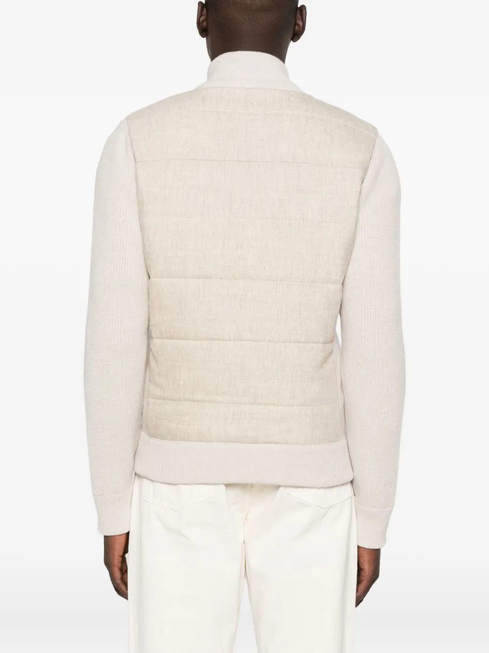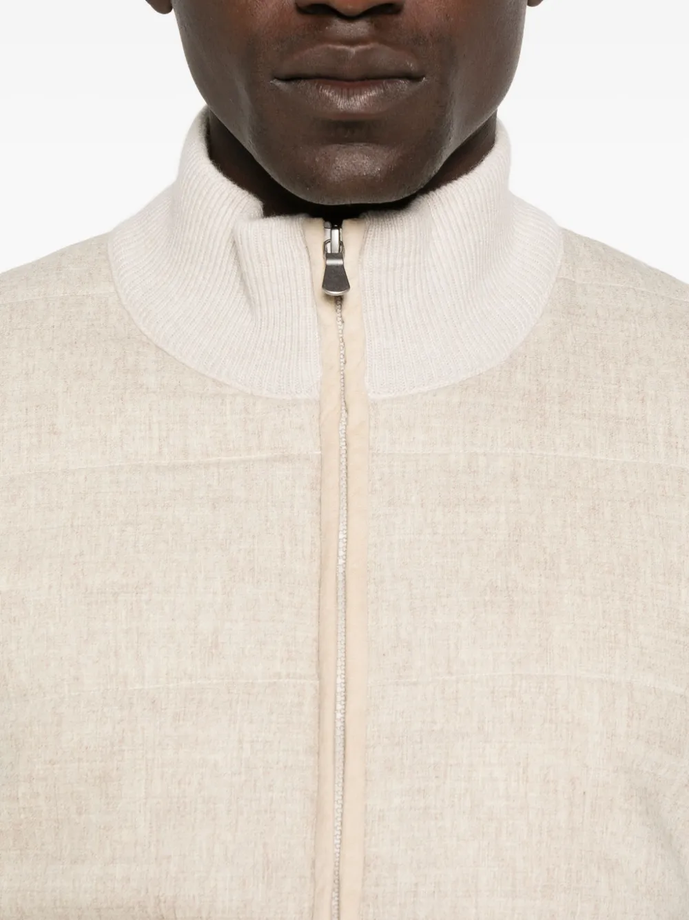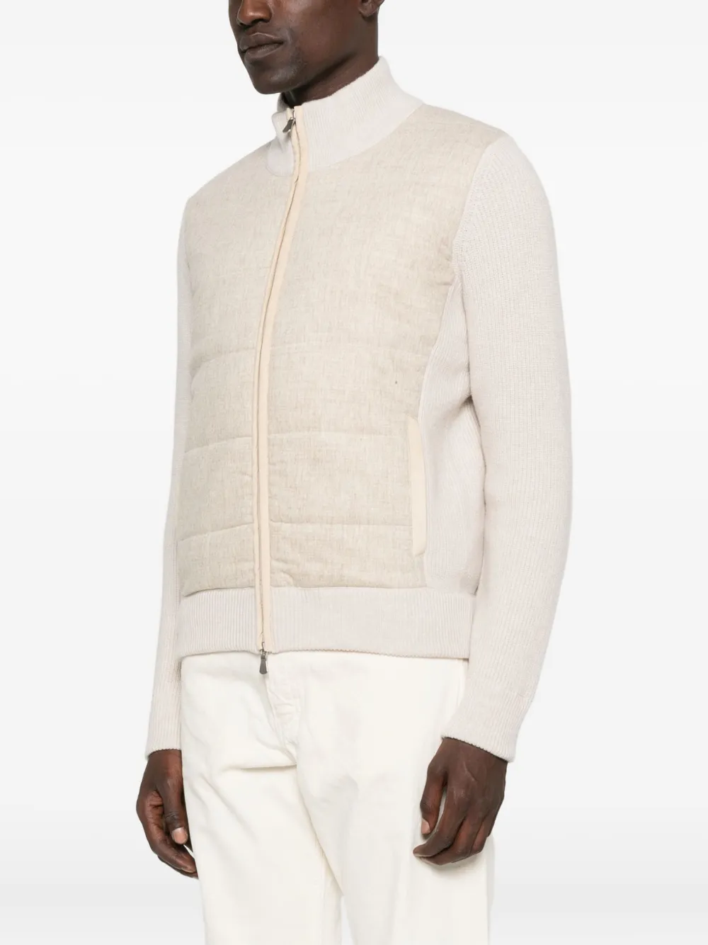 Бежевая стеганая панель, ребристые рукава, застежка-молния, ложный вырез горловины, прорезные карманы.