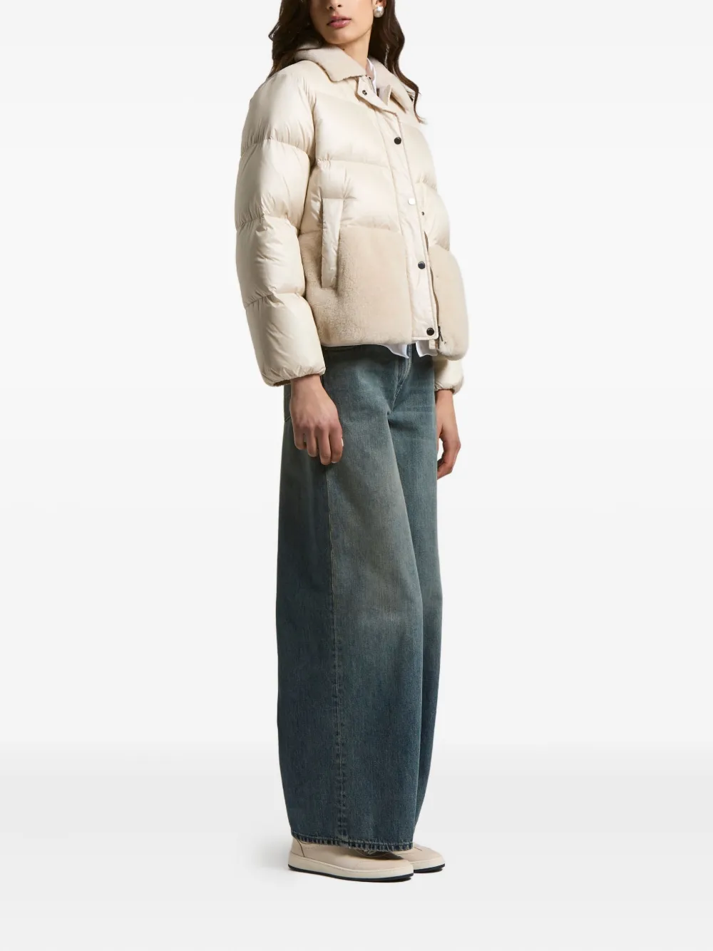 Бежевый стеганый дизайн, овчинные вставки, застежка на кнопки, высокий воротник, длинные рукава