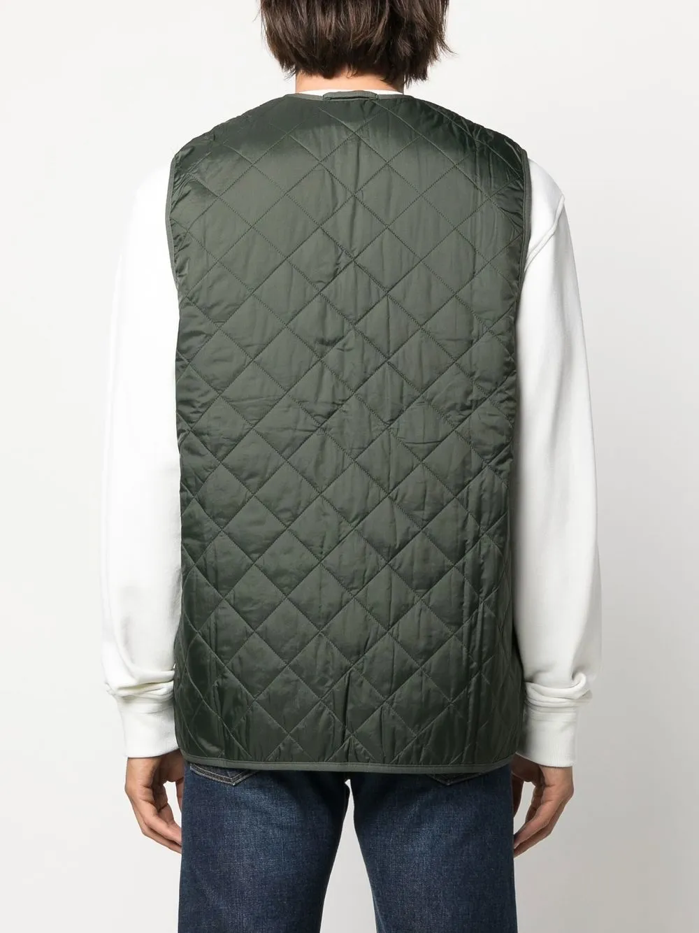 Оливково-зеленый, хлопок, стеганый материал, вышитый логотип спереди, подкладка из хлопка, без рукавов, V-образный вырез, застежка на молнии спереди и два накладных кармана спереди.