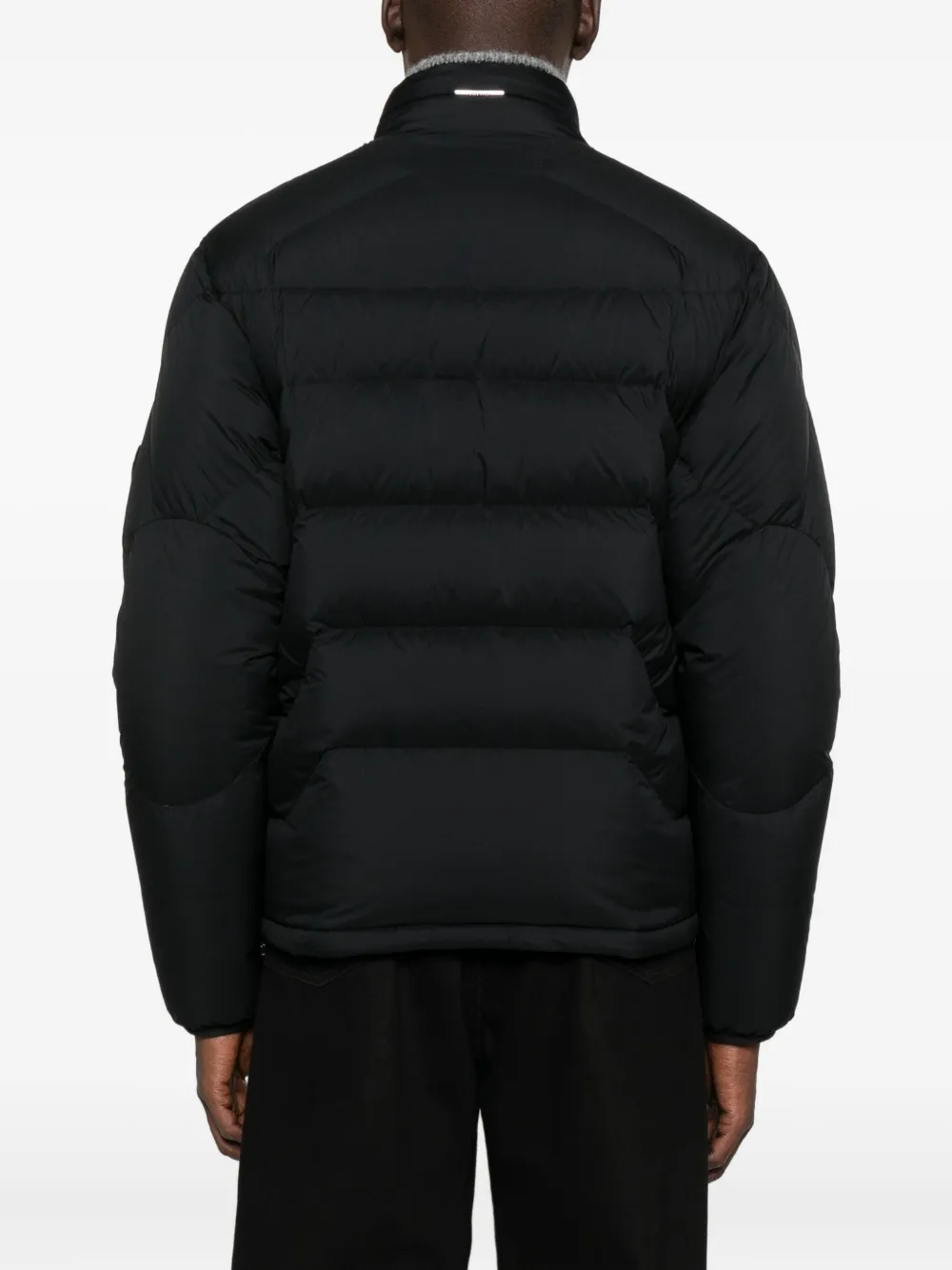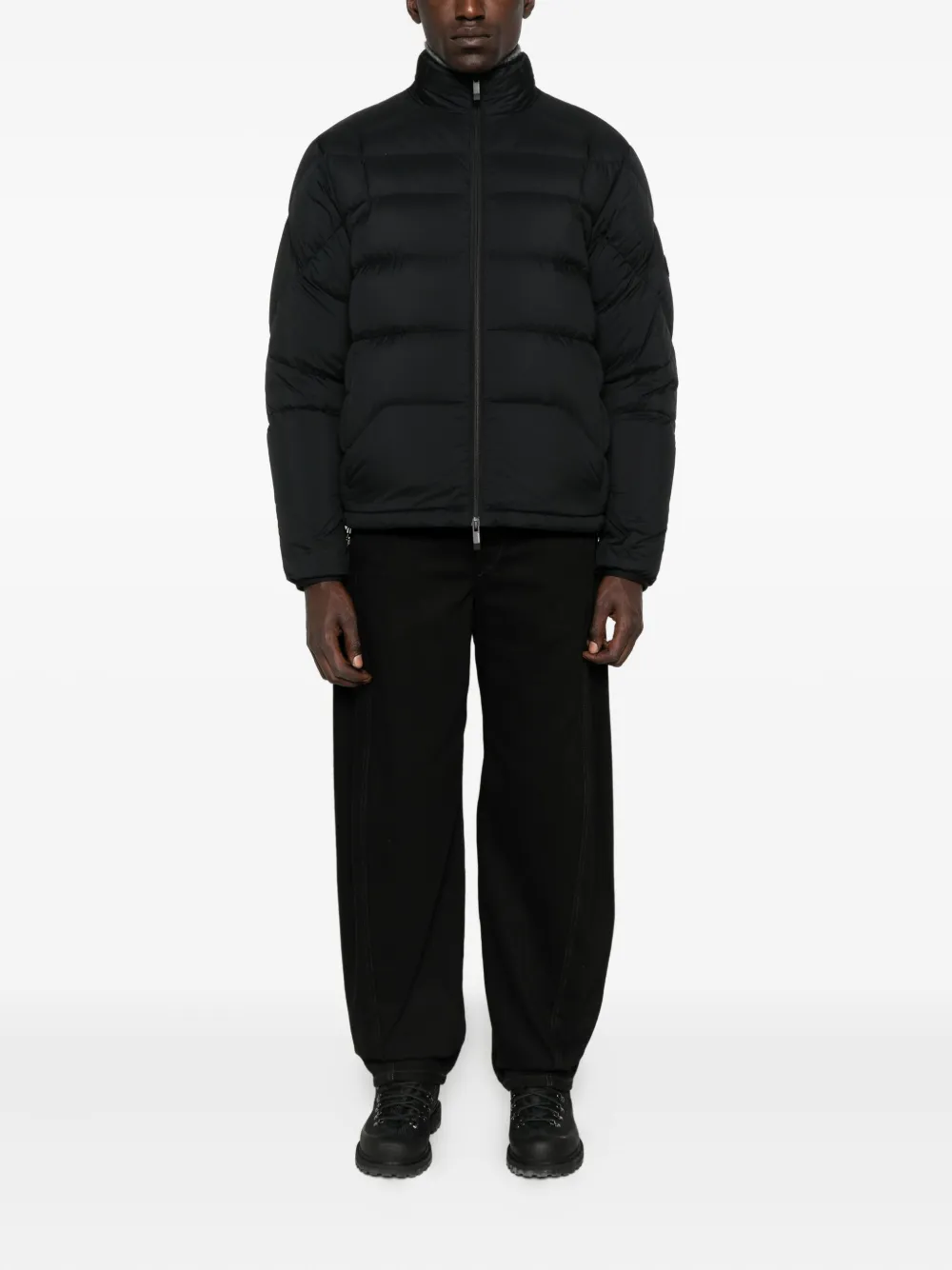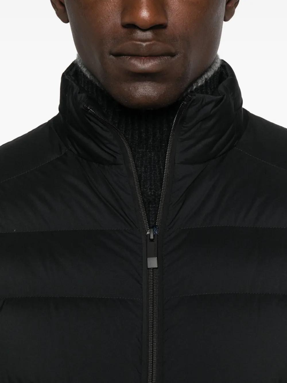 Черная стеганая модель, застежка-молния, высокий ворот, длинные рукава, затягивающийся шнурок по низу.