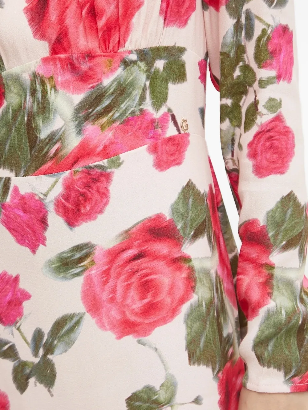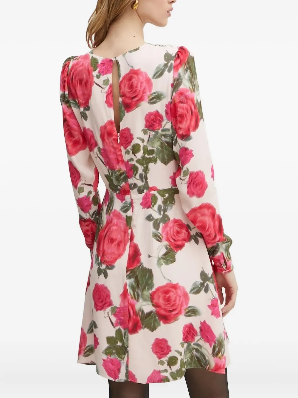 Розовый принт с розами, длинные рукава, присборенный вырез горловины, застежка-молния сзади, приталенный фасон на талии.