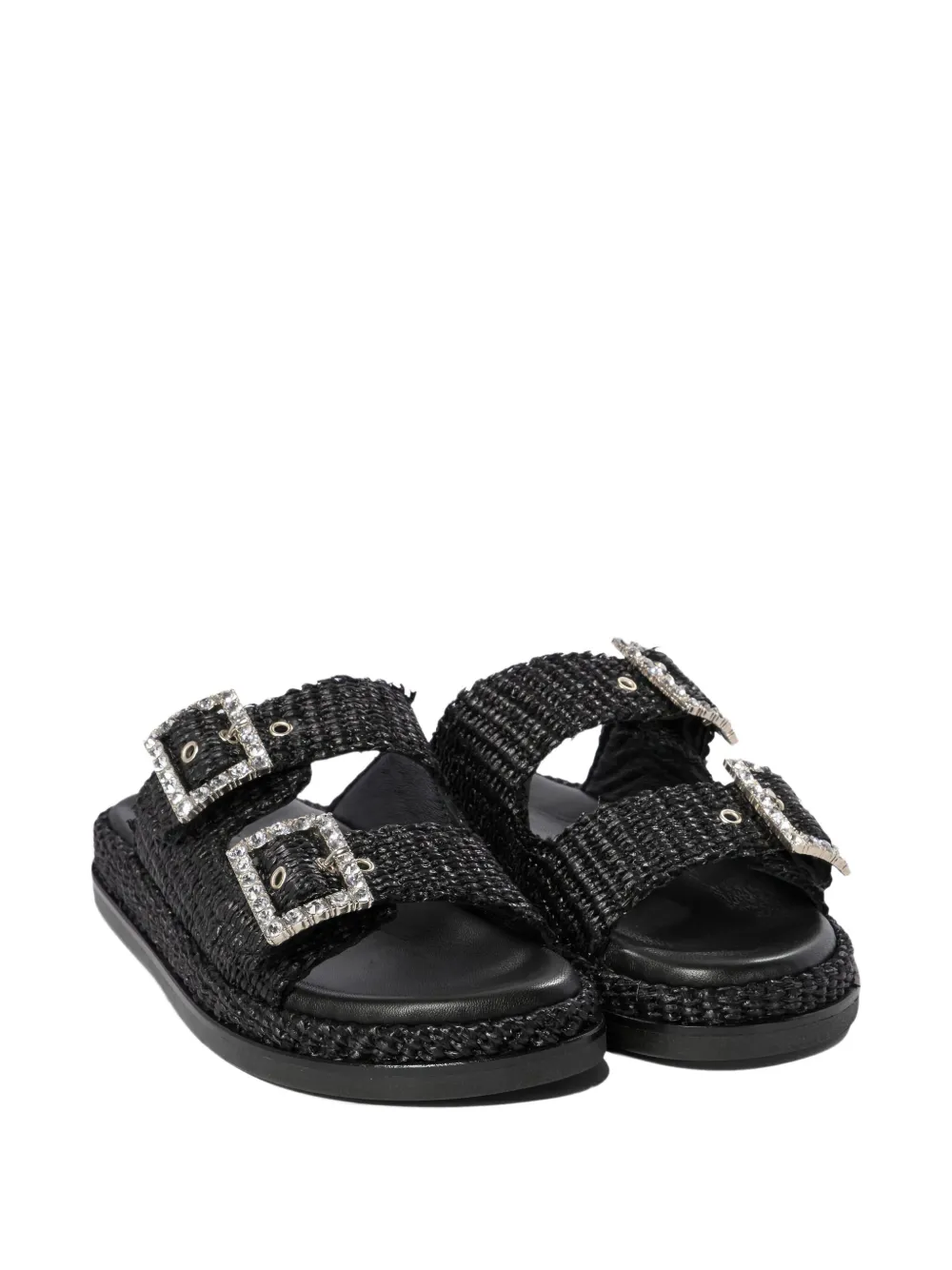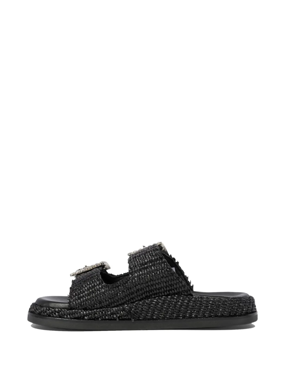Черная рафия, застежка на две пряжки, украшение из кристаллов, платформа, плоская подошва