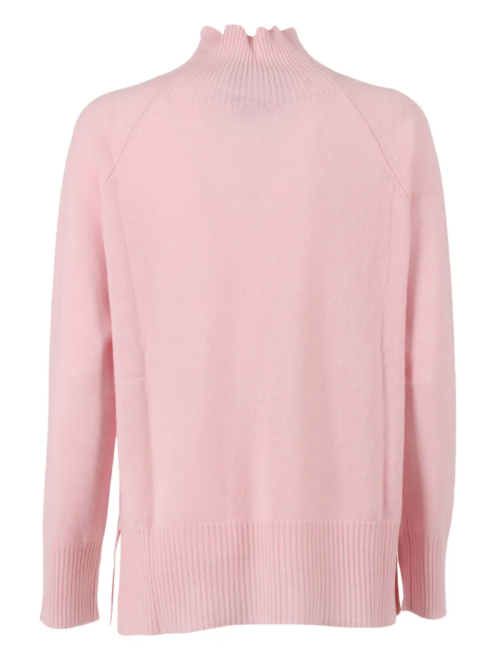 Розовая водолазка, рукава реглан, боковые разрезы, ребристый подол, ребристые манжеты.