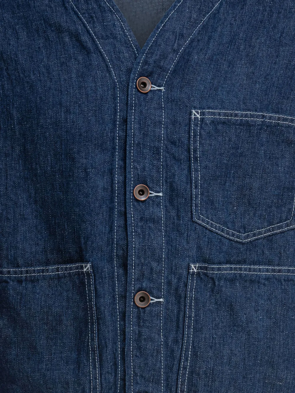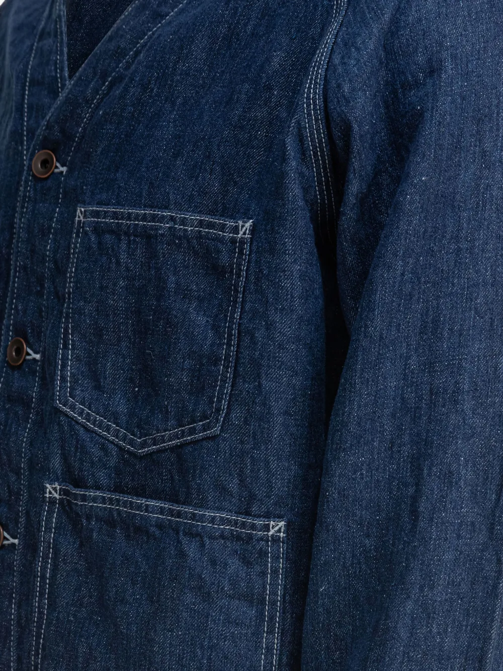 Застежка на пуговицы синего цвета, рукава реглан, множество карманов, контрастная строчка.