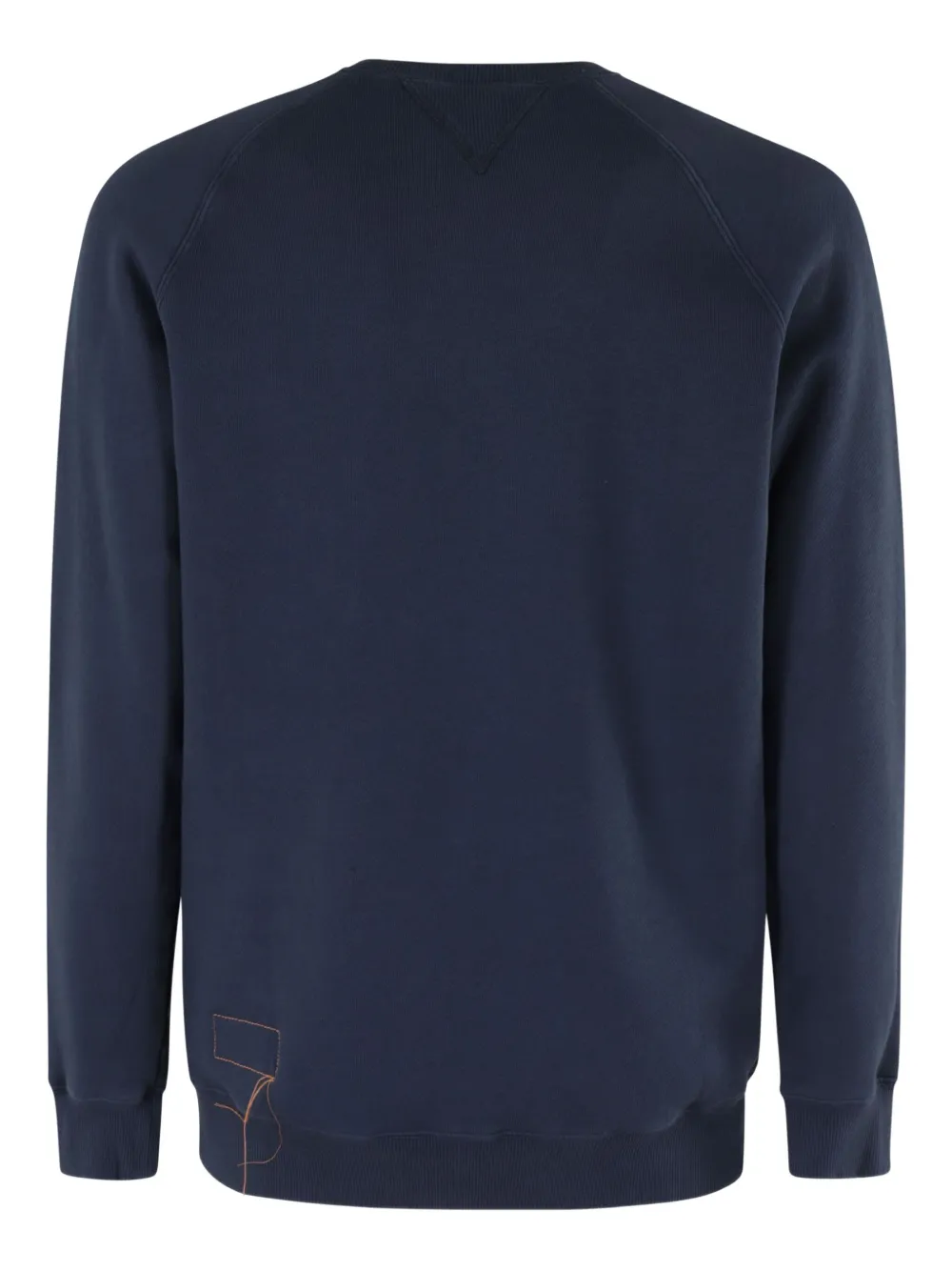 Темно-синие рукава реглан, круглый вырез горловины, ребристые манжеты и низ.