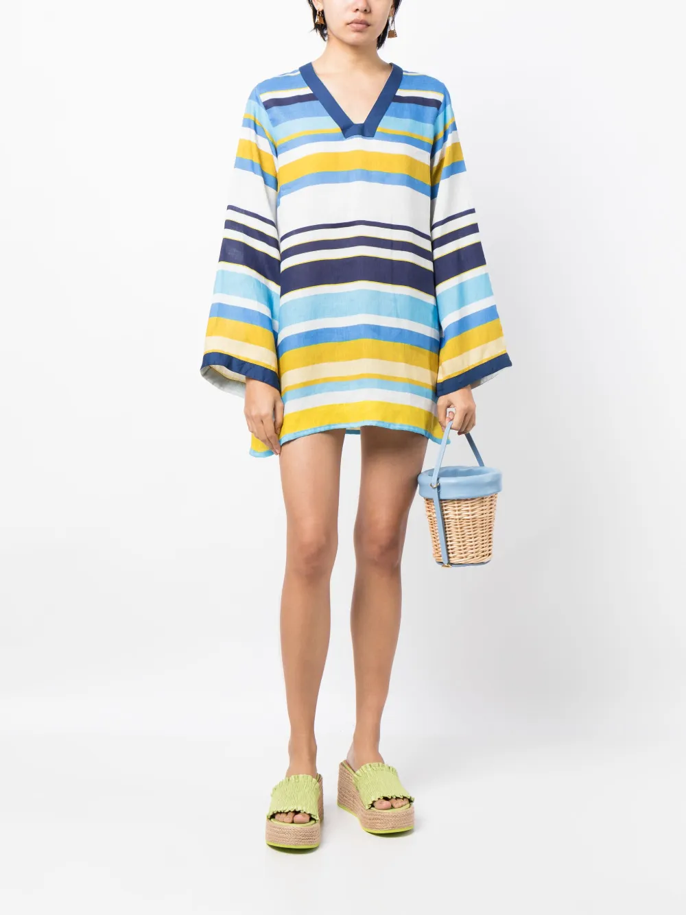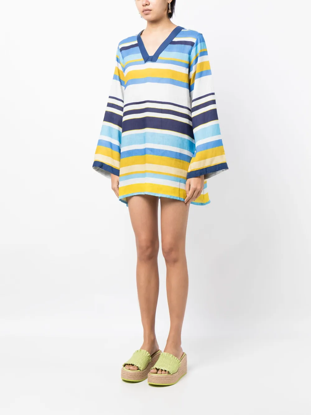Подробнее о товаре: Белый/разноцветный, лен, принт в горизонтальную полоску, V-образный вырез, длинные широкие рукава и прямой подол. Этот товар как минимум на 50% состоит из материалов, которые признаны более безопасными для окружающей среды, и/или произведены с использованием методов, которые помогают сократить потребление воды и химических веществ. Узнать больше о том, какие товары получают отметку «Ответственный выбор», можно из материала «Как мы оцениваем экологичность и этичность».