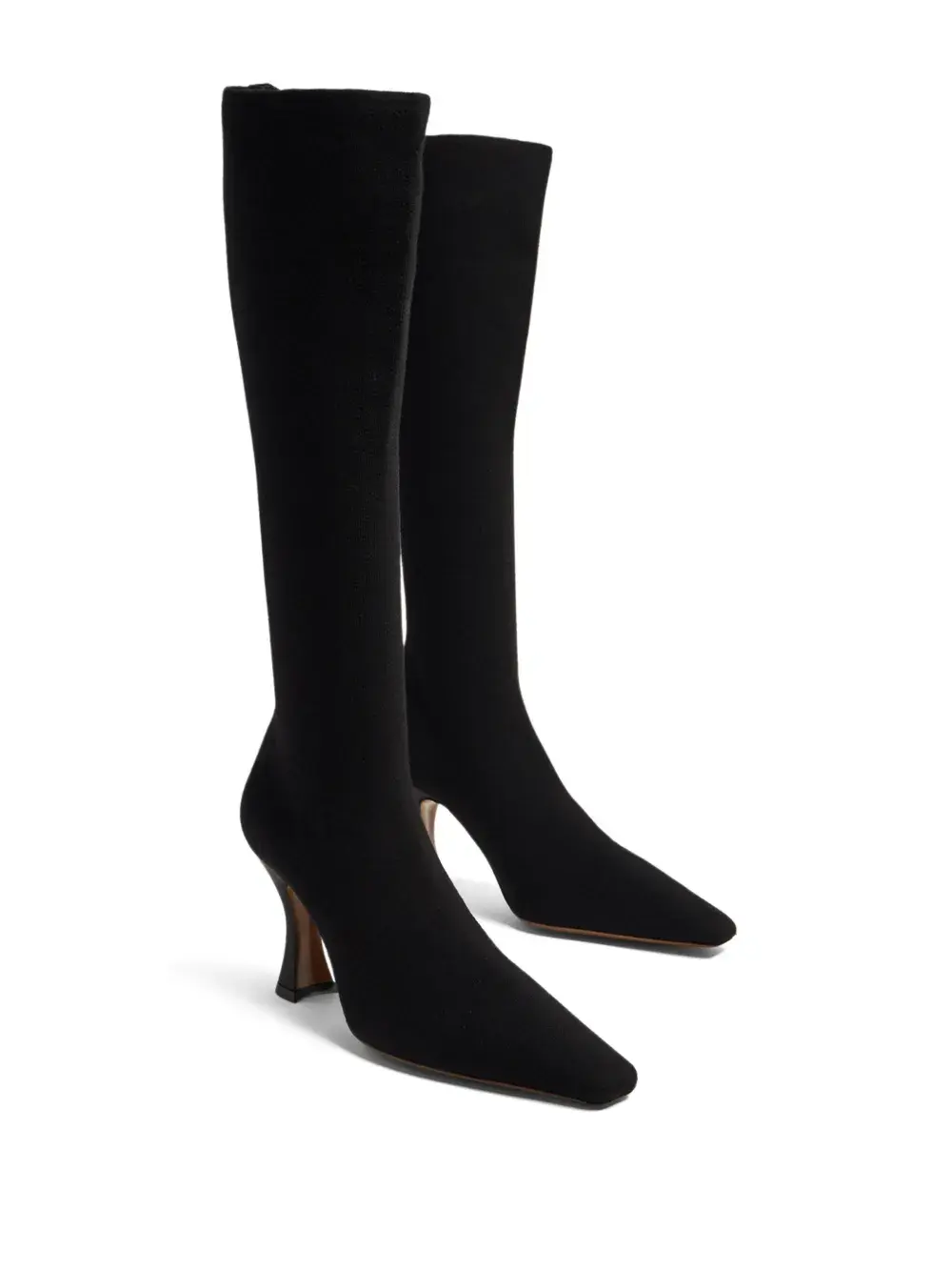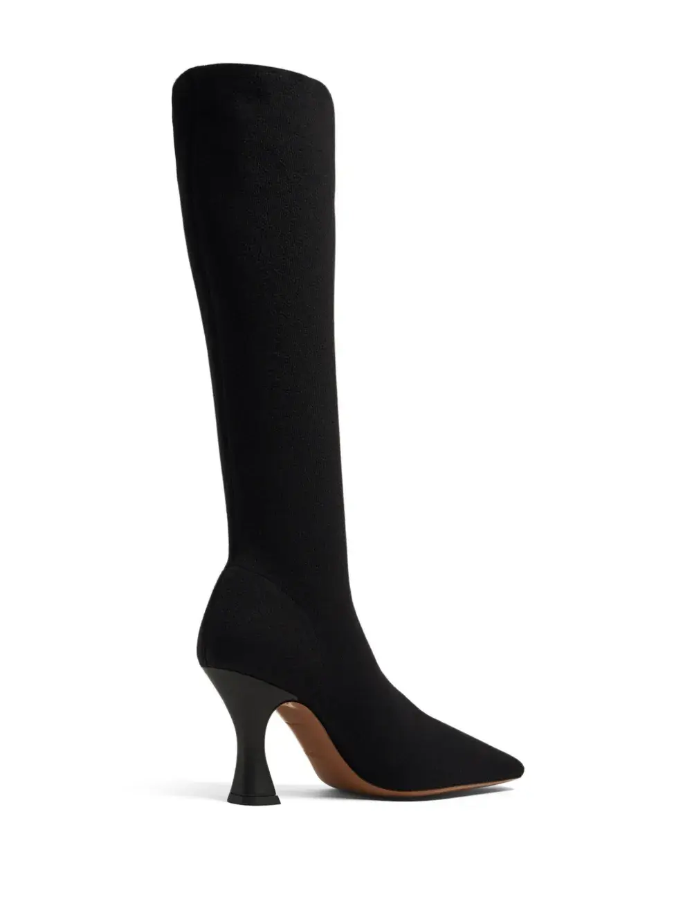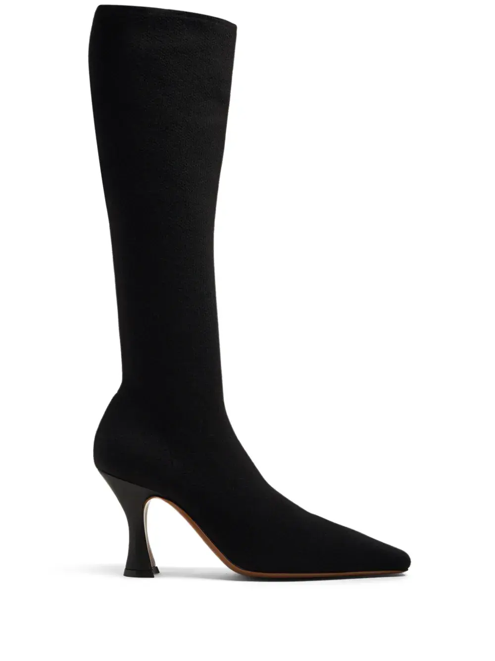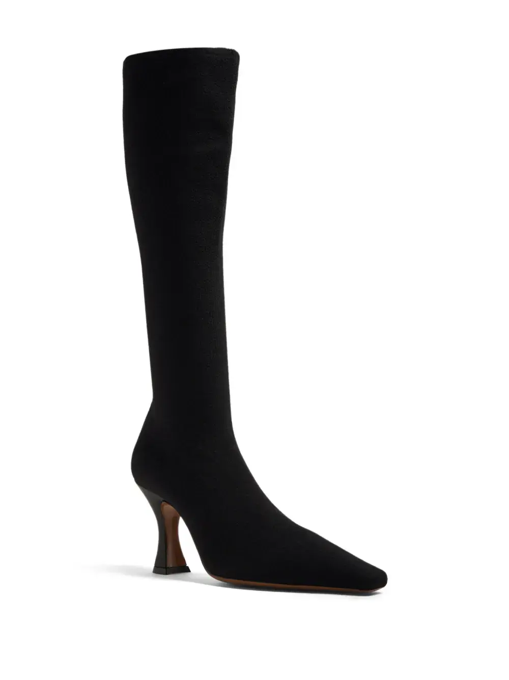 Черный, шерсть, квадратный носок, высота по колено и высокий скульптурный каблук.