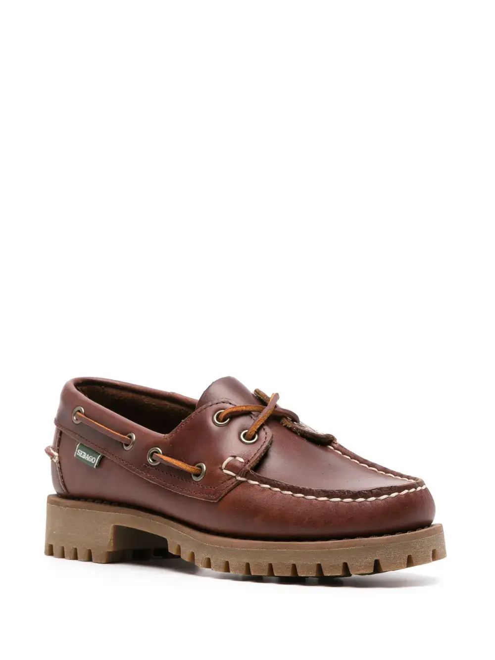 Коричневый, телячья кожа, нашивка с логотипом сбоку, закругленный носок, шнуровка спереди, кожаная стелька с логотипом и массивная резиновая подошва.