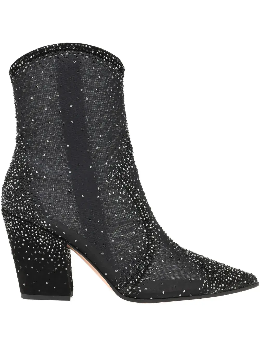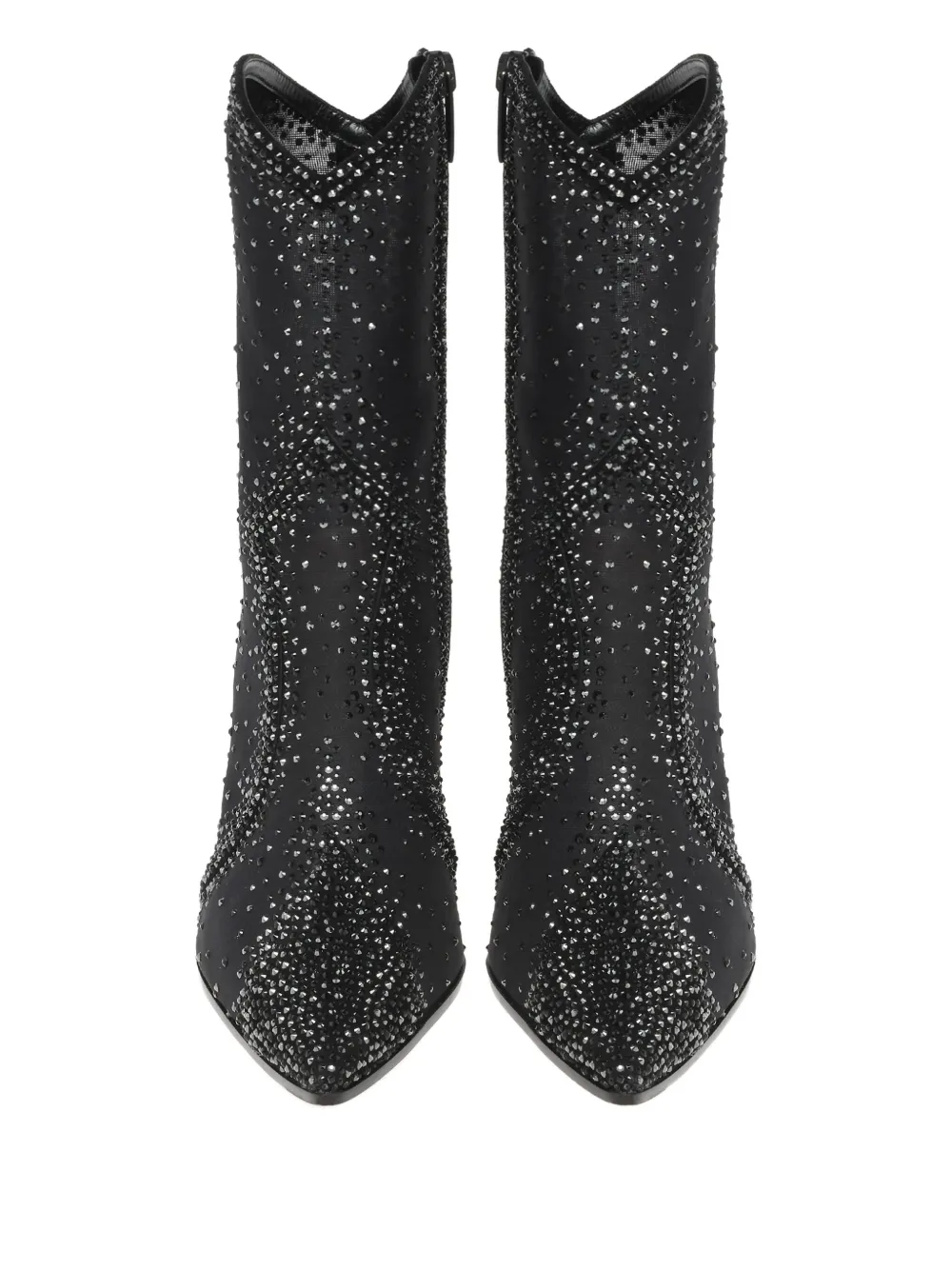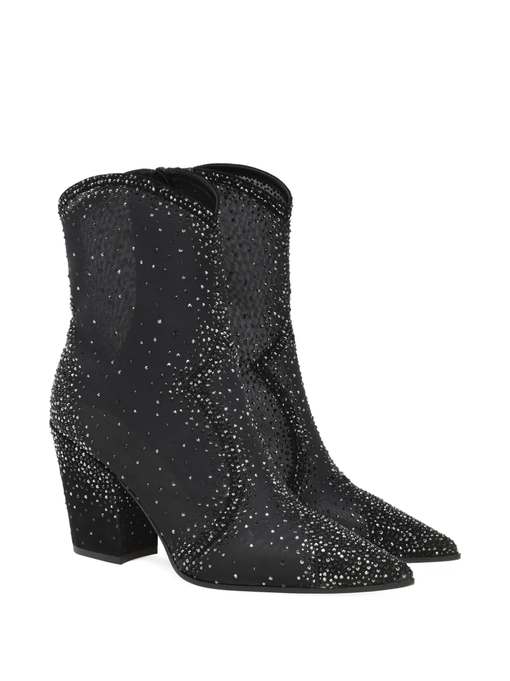 Черная застежка-молния сбоку, высокий блочный каблук, украшение из кристаллов, острый носок.