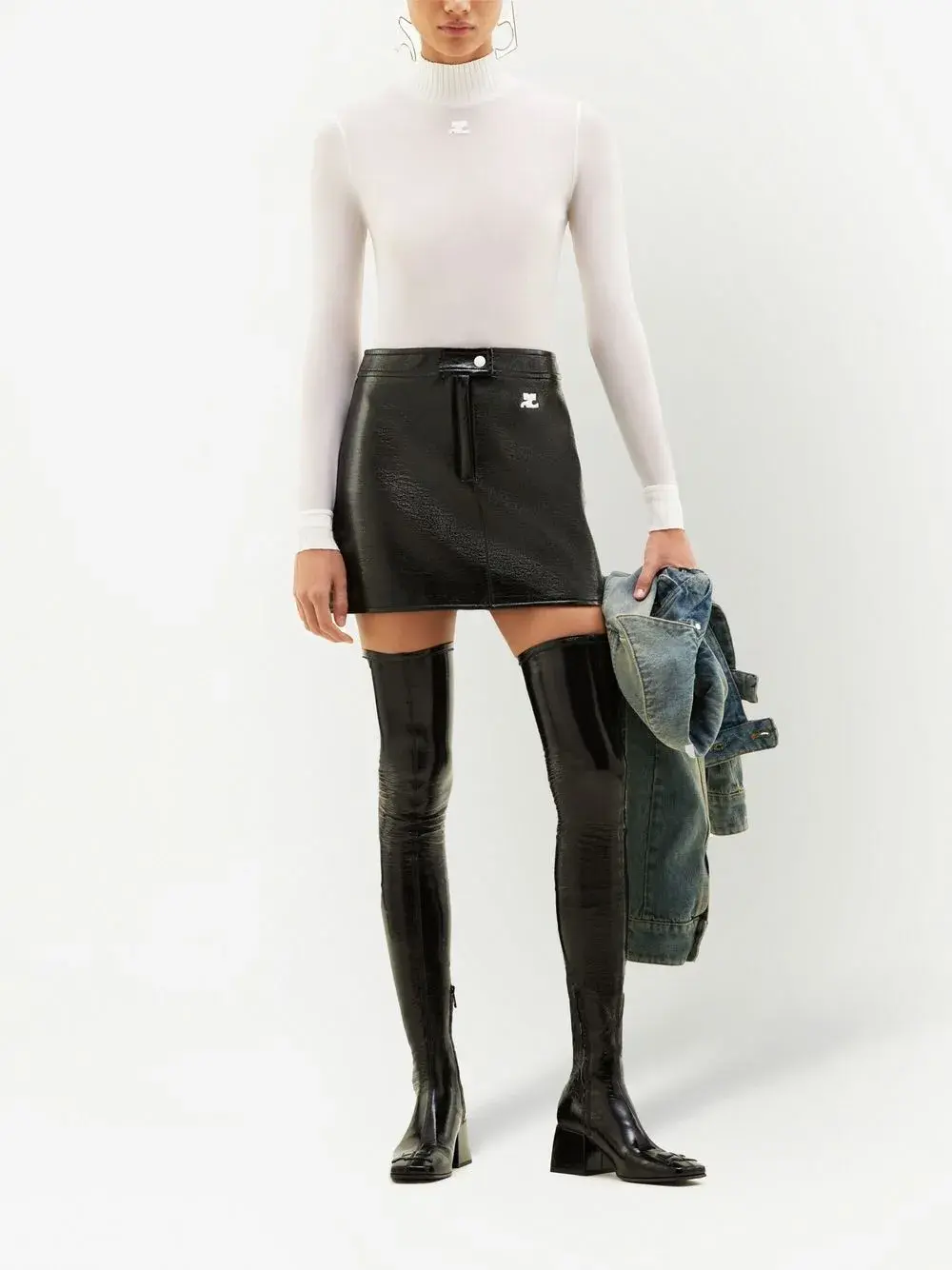 Белый, эластичный материал, логотип, отделка в рубчик, длинные рукава, высокий воротник и прямой подол.