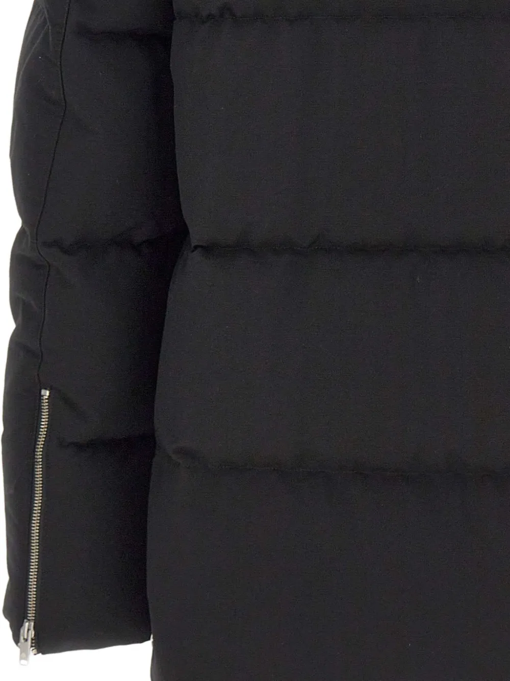 Черный стеганый дизайн, съемный капюшон, застежка-молния, металлический логотип, манжеты на молнии.
